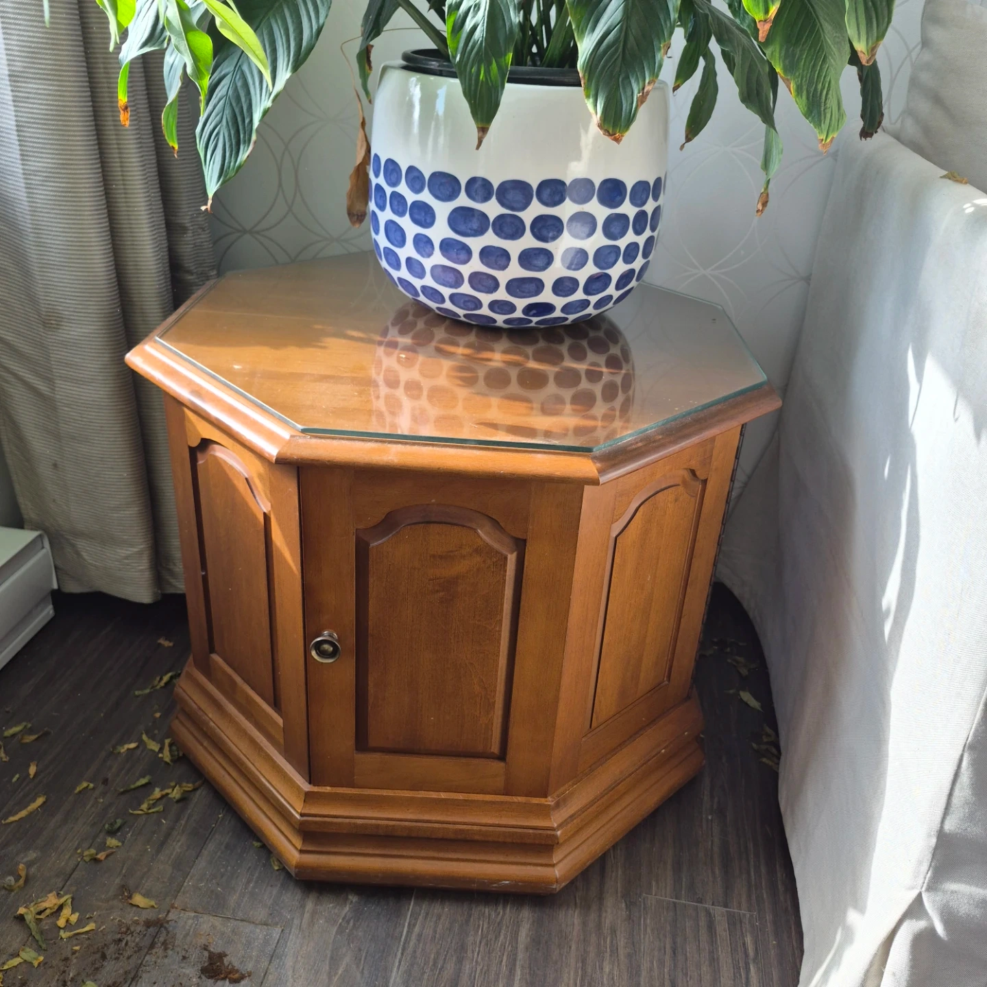 This wooden end table features a unique hexagonal shape and a glass top. It has a single cabinet door for storage. This table would be great for holding a lamp or decor items next to a couch or chair.