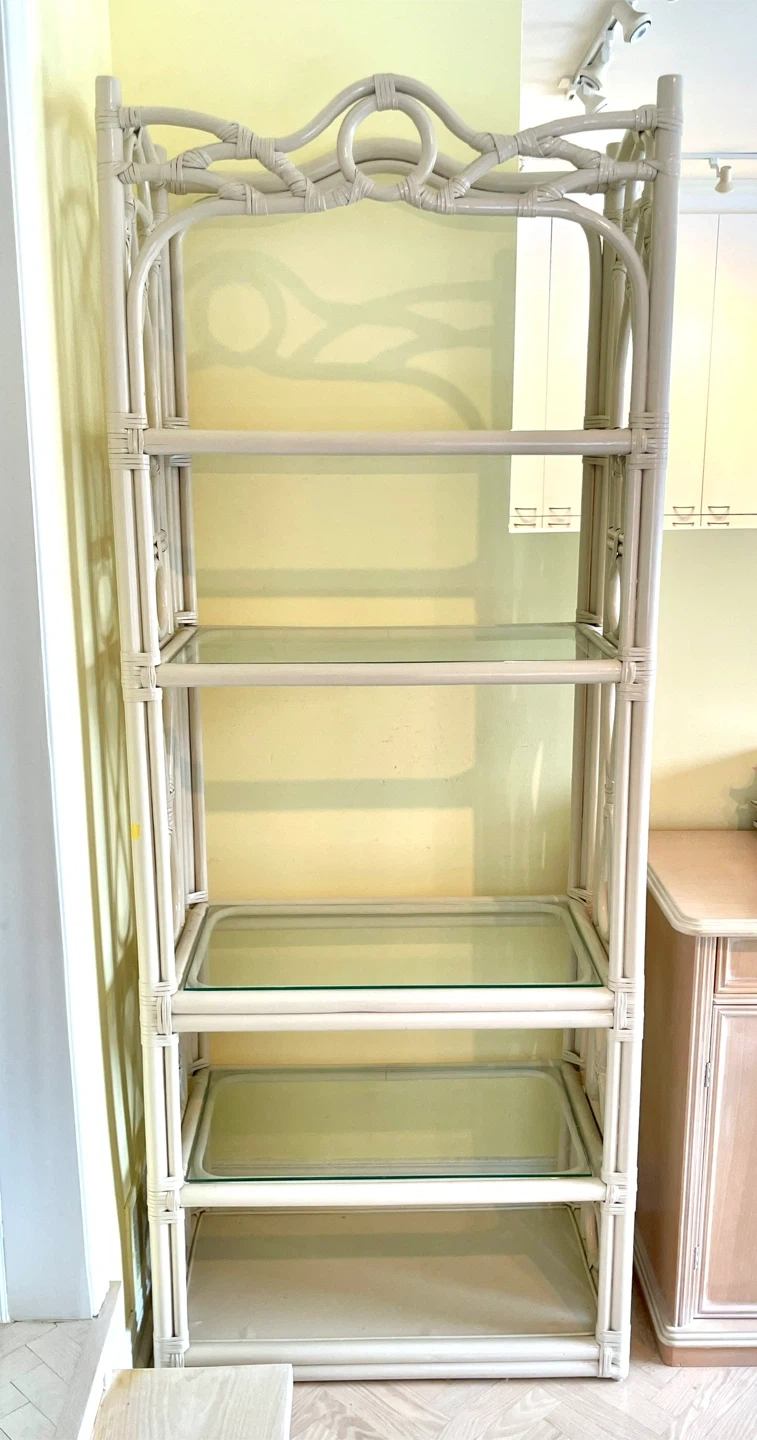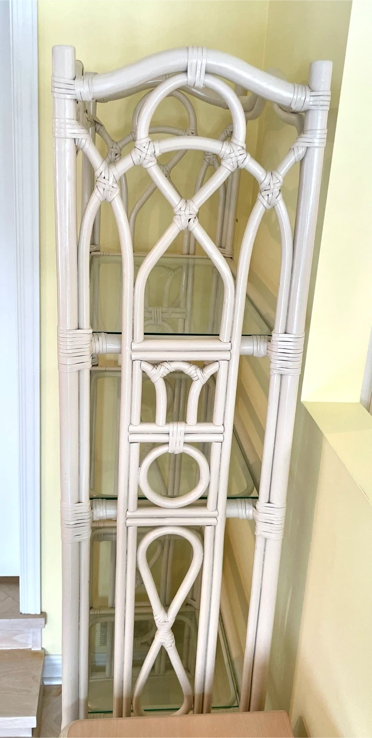 This cream-coloured shelf unit features a charming rattan frame with decorative scrollwork. It has five glass shelves offering ample display space. Its unique design adds a touch of elegance to any room. For pick up in King City.