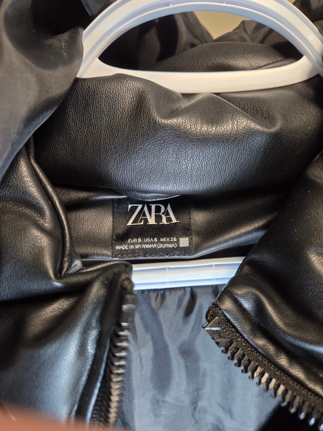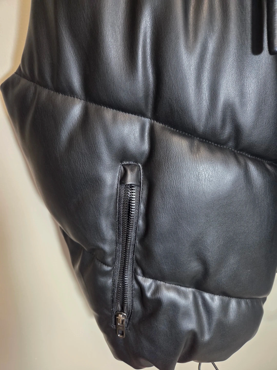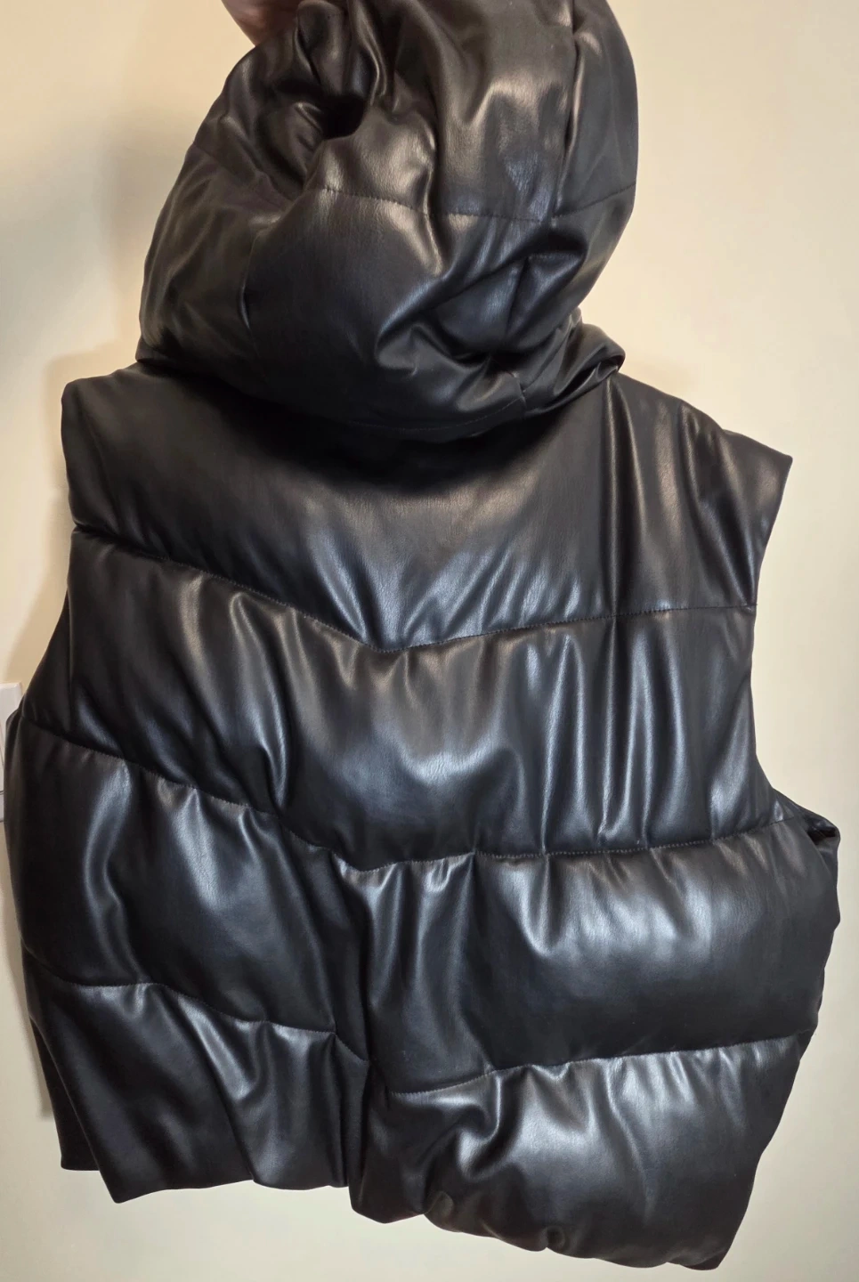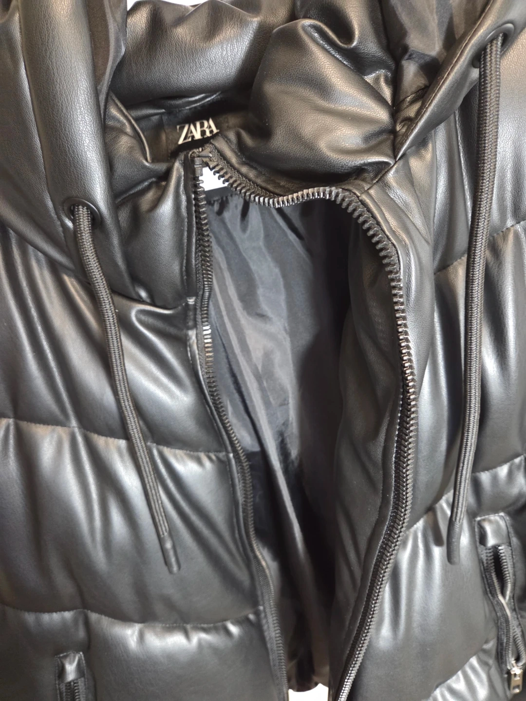 It's a black puffer vest from Zara. Faux leather material. Size small. Includes a hood and zippered pockets.