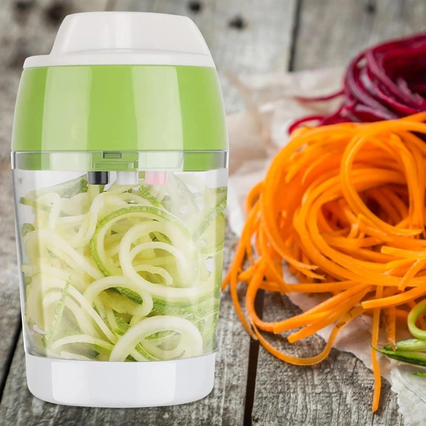This compact spiralizer makes vegetable noodles and ribbons. It has FDA-approved stainless steel blades for easy slicing. The container collects your spiralized veggies for simple prep!