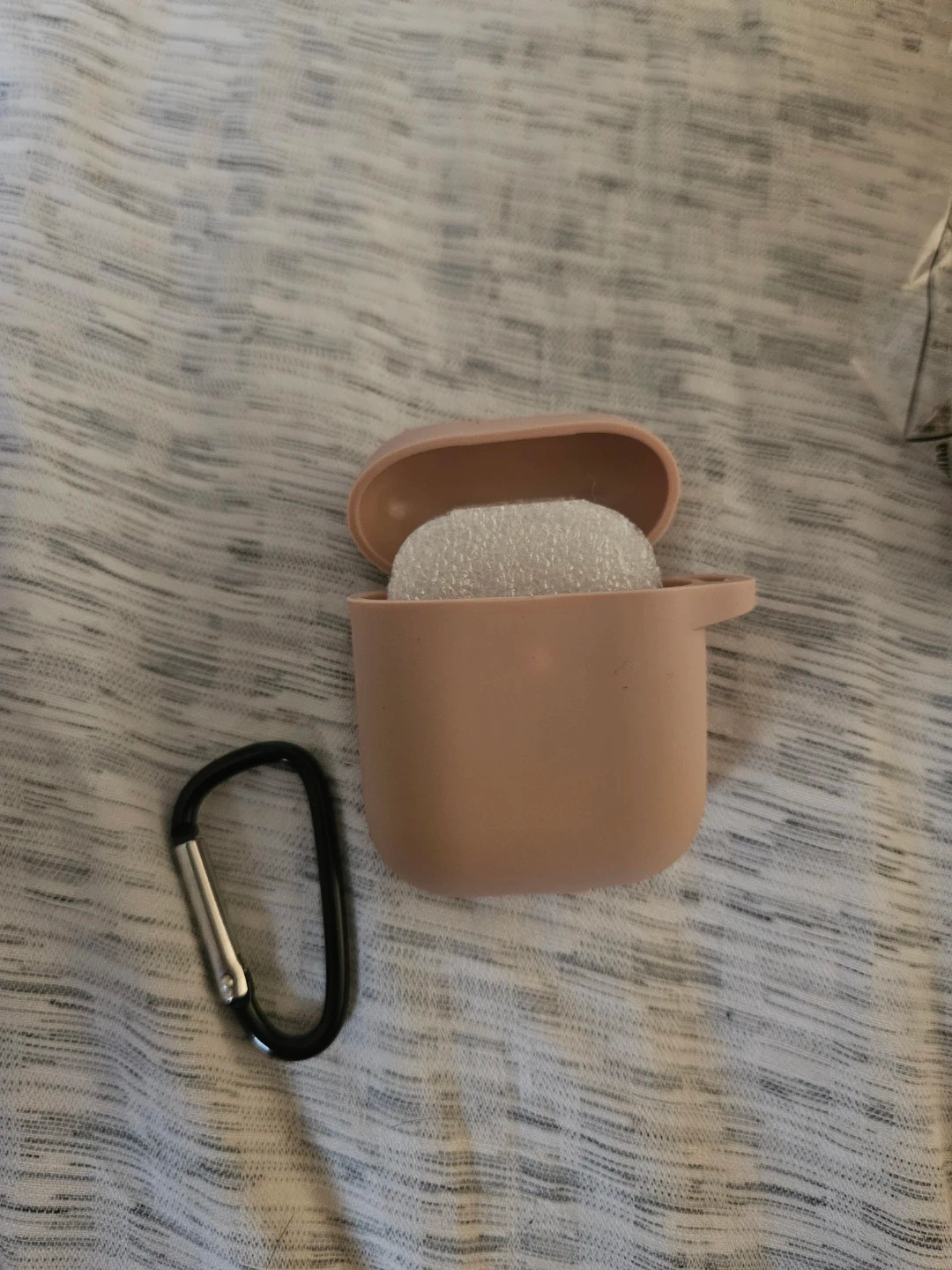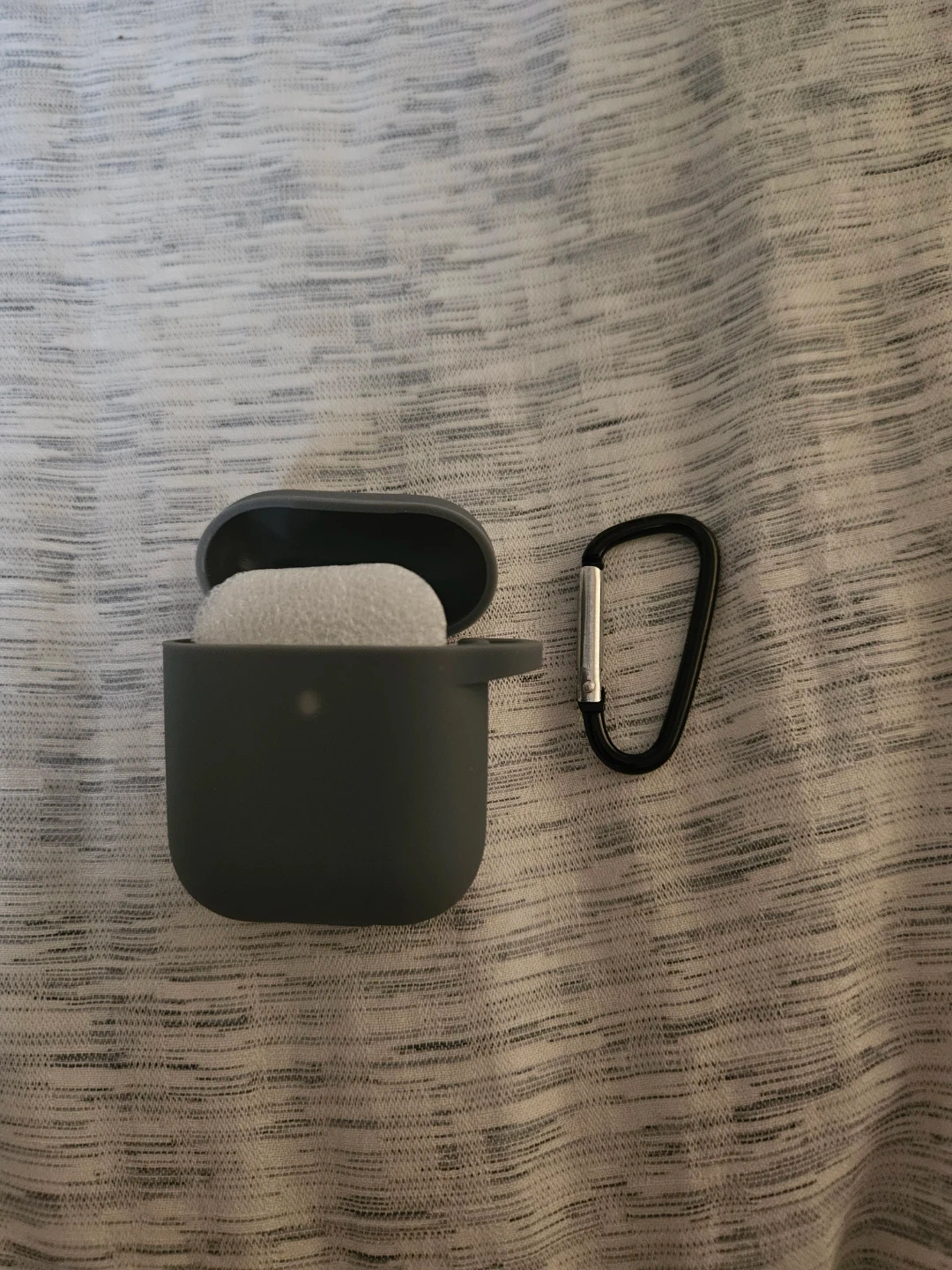 Selling an Airpods case in gray. It's in great condition and comes with a carabiner clip. Perfect for keeping your Airpods safe and secure!