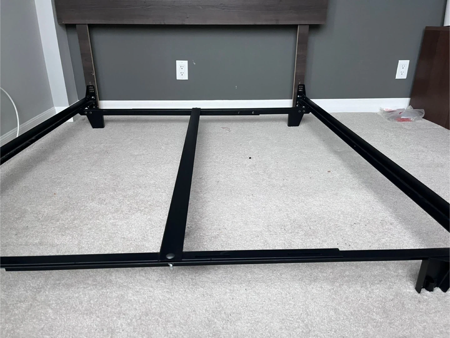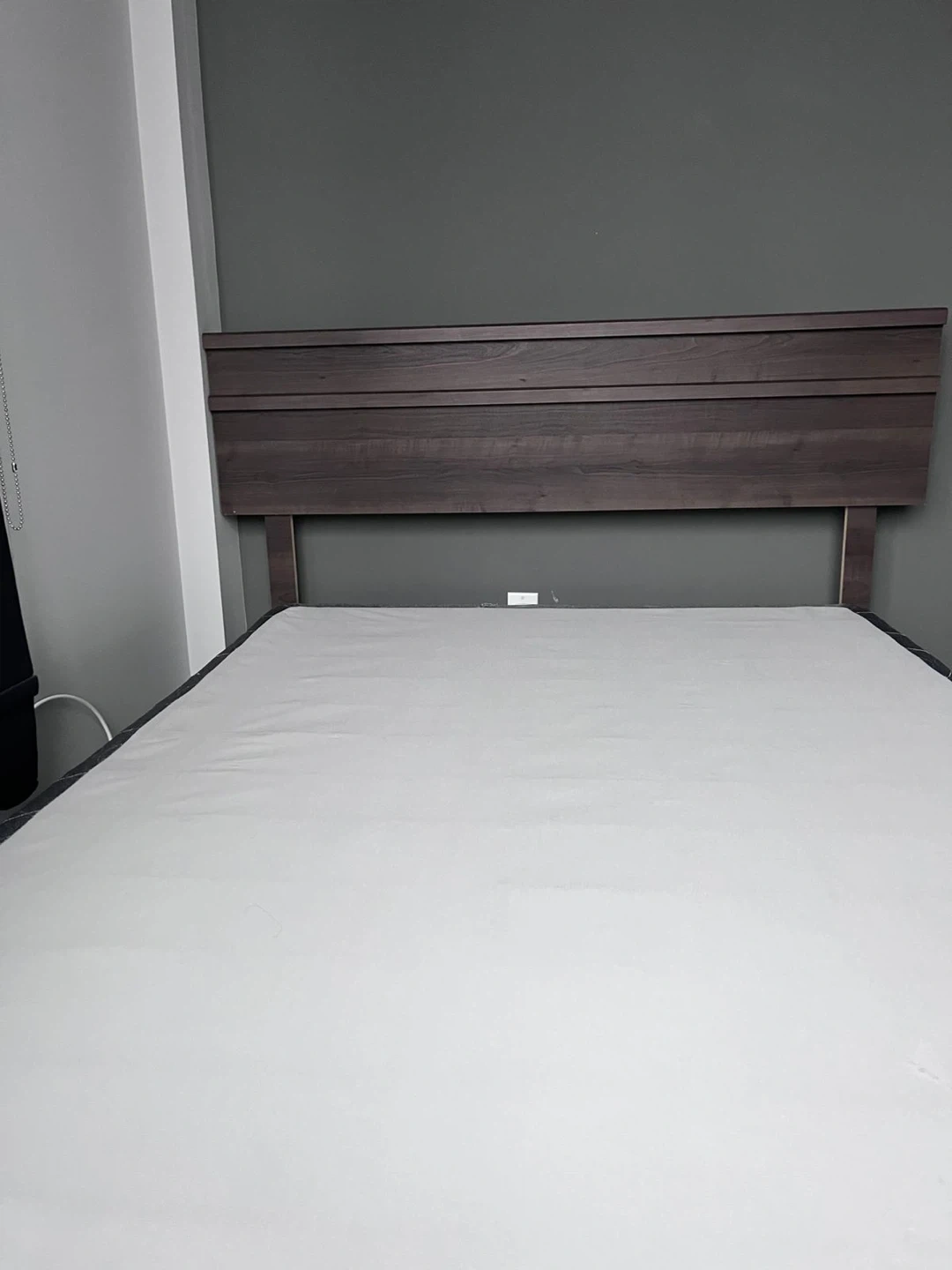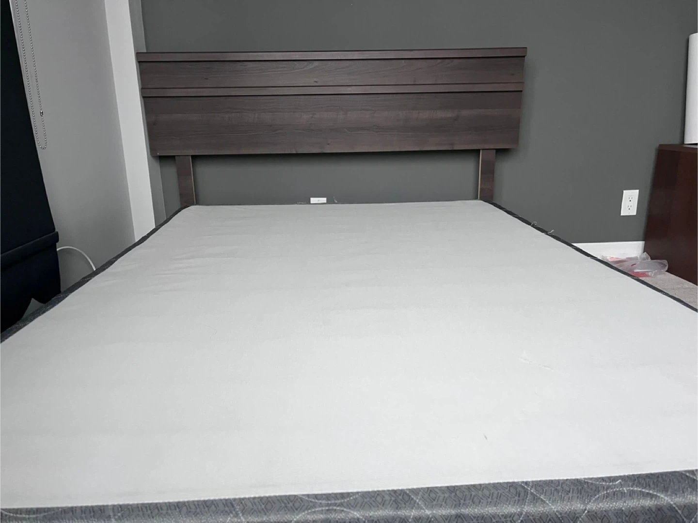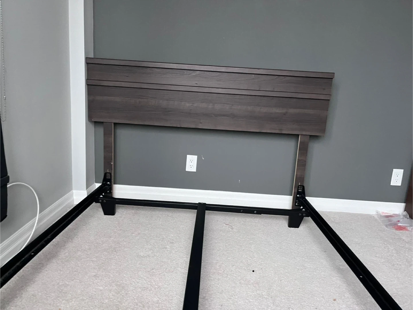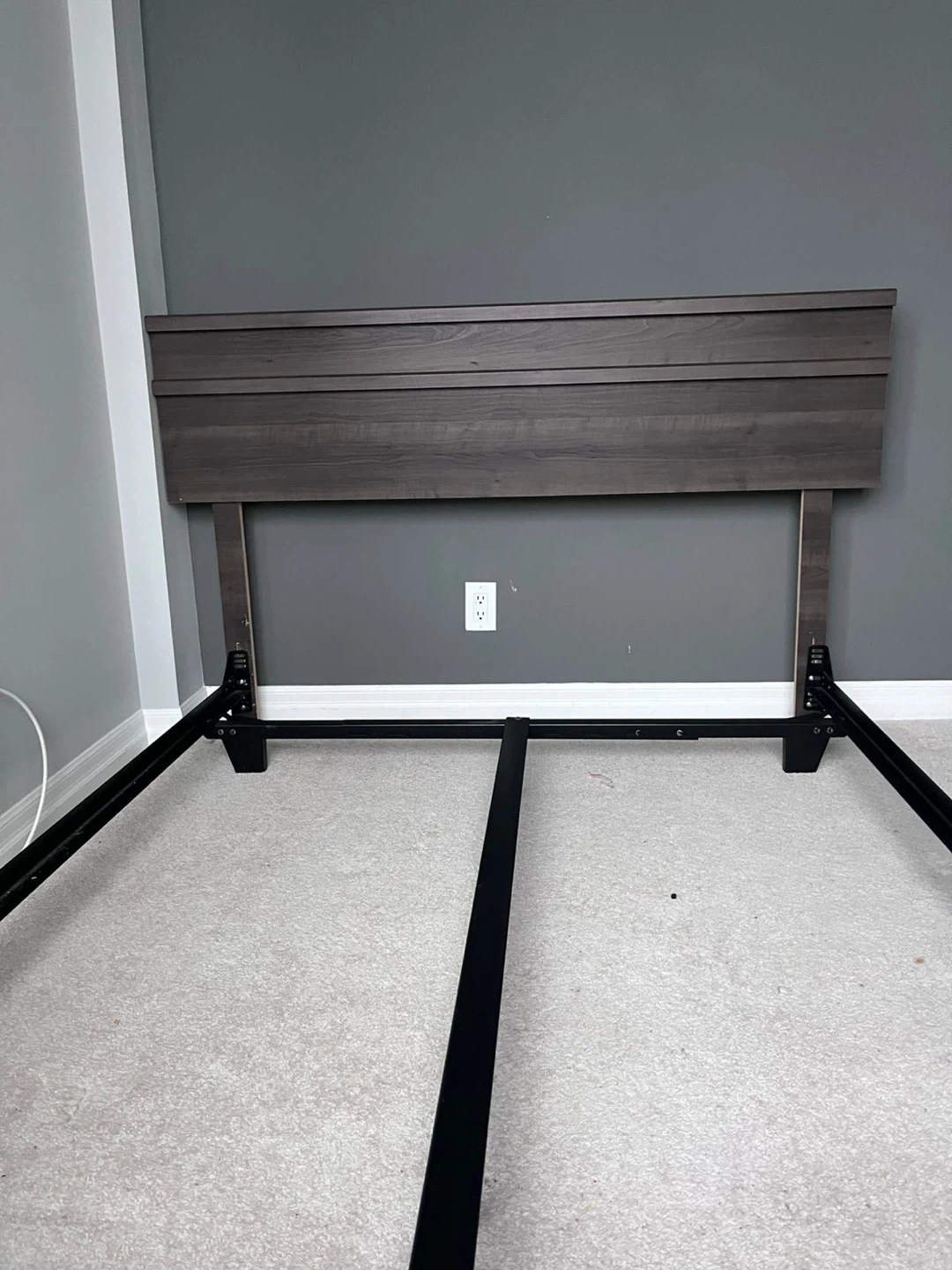 Stylish headboard in a dark wood finish with horizontal slat detailing. Sturdy black metal bed frame and box spring( like new ) . Everything in excellent condition. Need gone by weekend