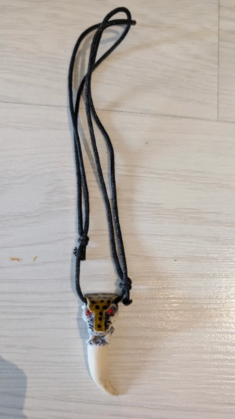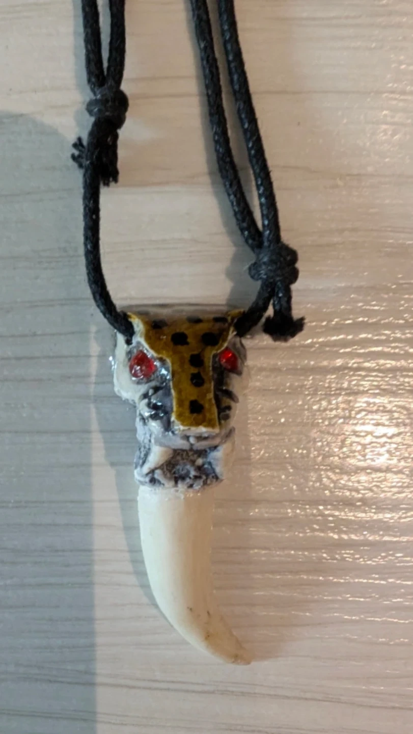 A unique pendant necklace featuring a tiger's tooth design with red eyes. It hangs on an adjustable black cord.