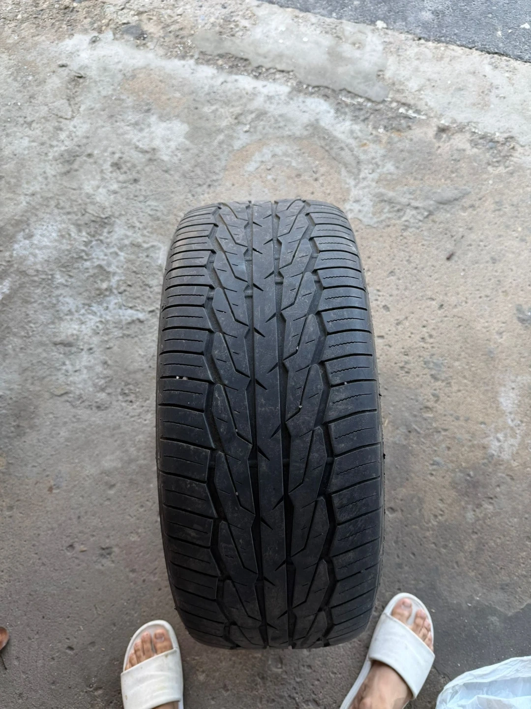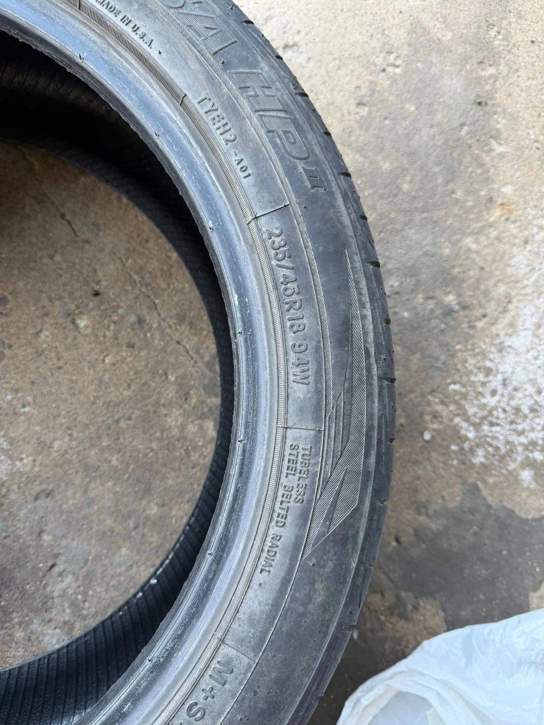 A Goodyear Assurance tire, size 235/45R18. Radial tire with steel-belted radial construction. Tubeless design. I have 2 tire available all season.