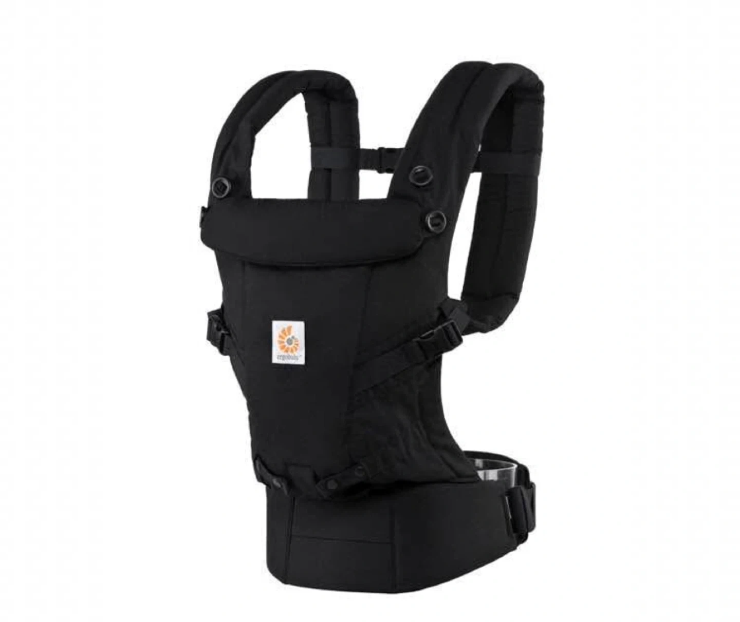 This is an Ergobaby Adapt baby carrier in black. It's designed for newborns to toddlers weighing 7-45 lbs. The carrier offers multiple carrying positions for comfort.