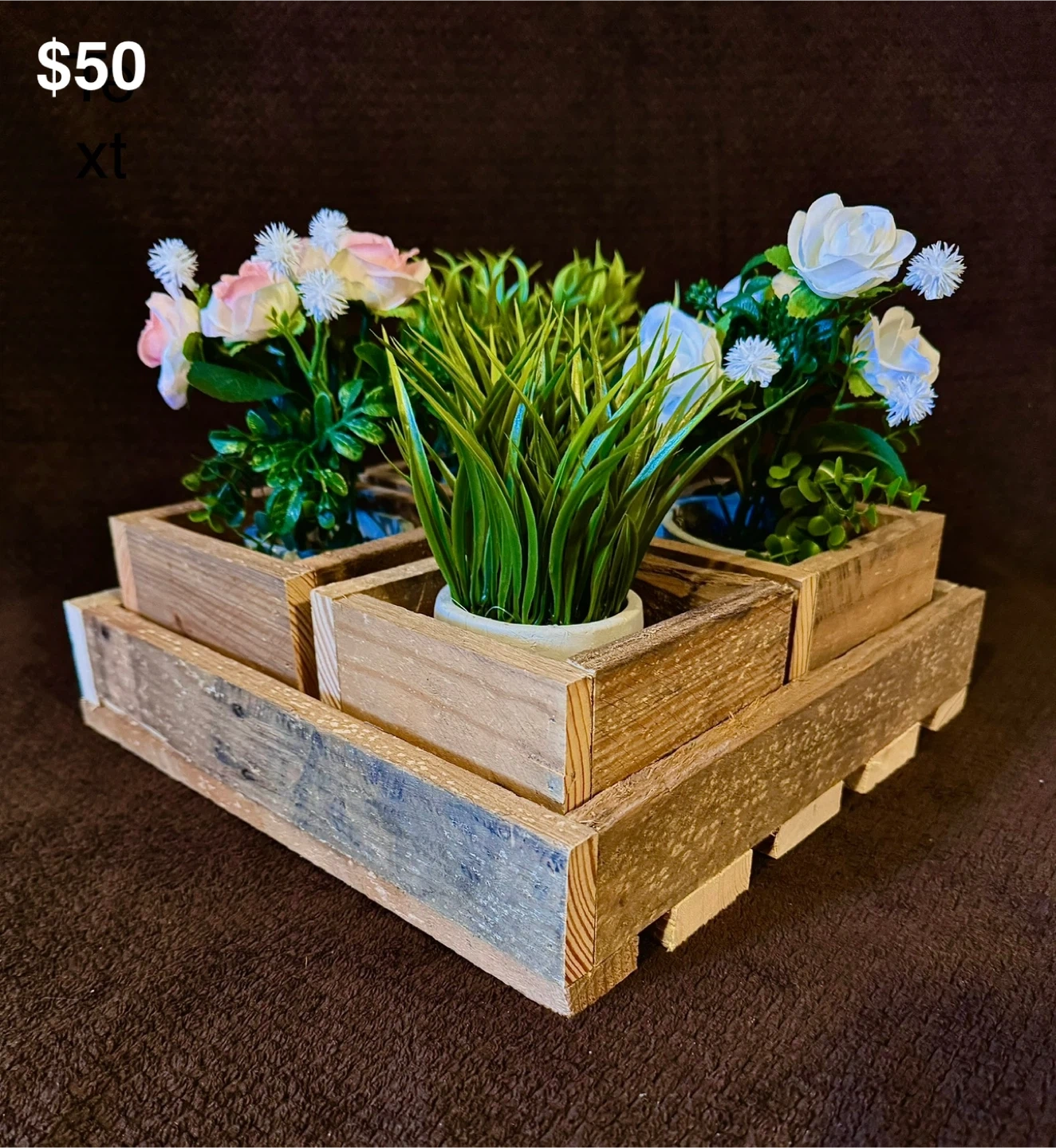 Three wooden planters that are great for centrepieces at weddings, dinning room tables, coffee tables and more. It's a charming way to add a touch of rustic chic to any room. They all come natural wood that you can finish to your desire. Made of pine or cedar.