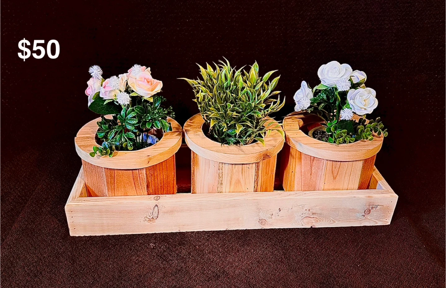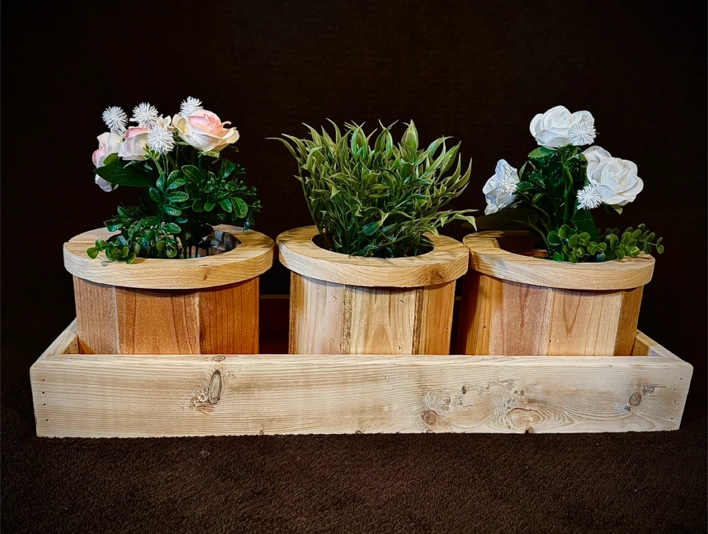 Three wooden planters that are great for centrepieces at weddings, dinning room tables, coffee tables and more. It's a charming way to add a touch of rustic chic to any room. They all come natural wood that you can finish to your desire. Made of pine or cedar.