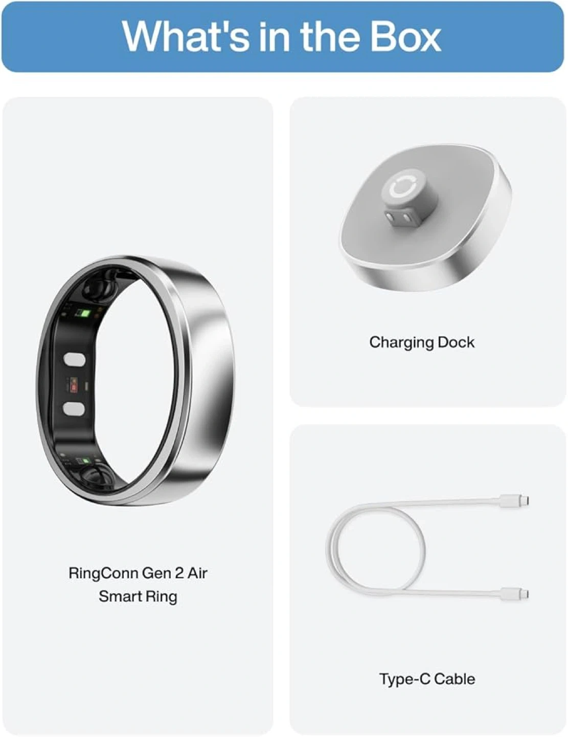 This is the RingConn Gen 2 Air Smart Ring size 7. It's silver and comes with a charging dock and a Type-C cable. Tracks health metrics for all!
