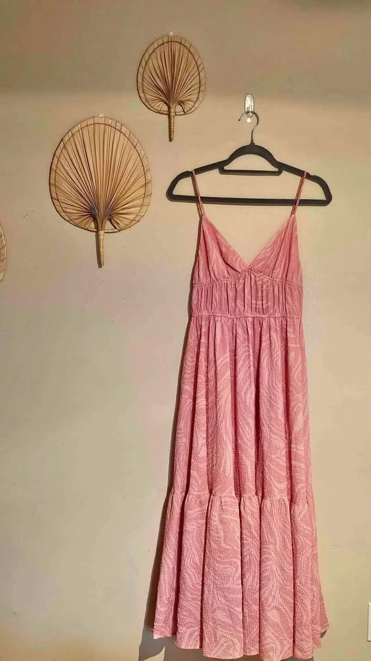 Pink and white patterned midi dress with a v-neck and spaghetti straps.
