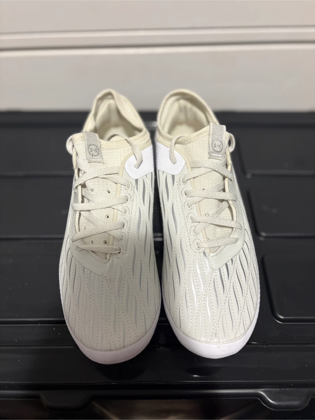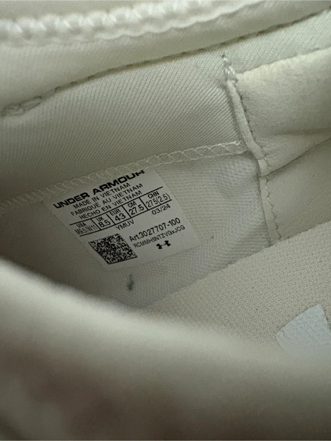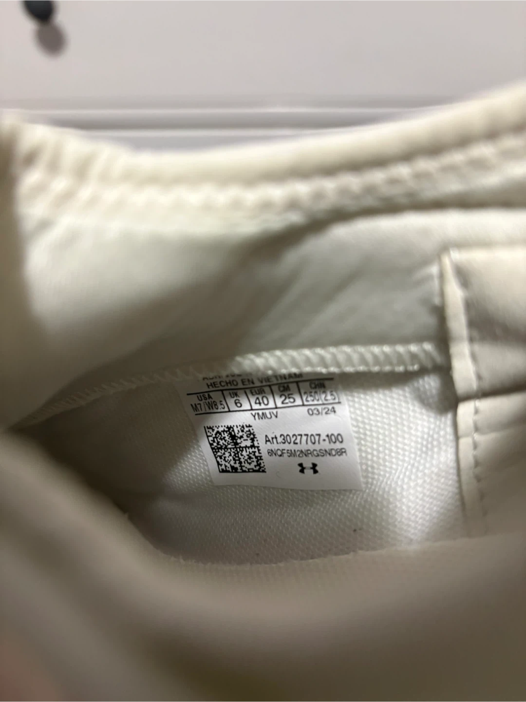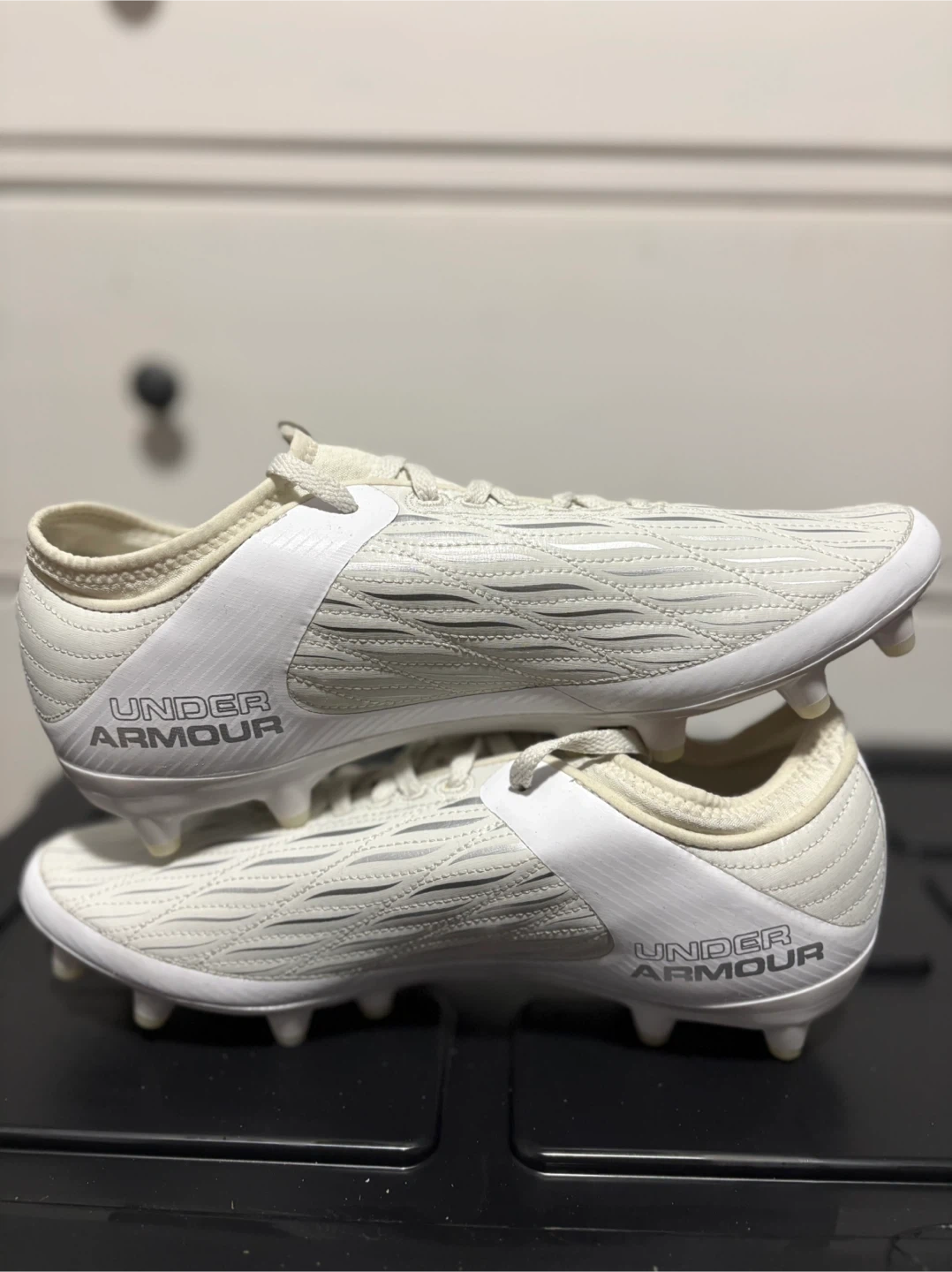 These are Under Armour cleats in white. They have a standard lace-up closure and rubber cleats for traction.