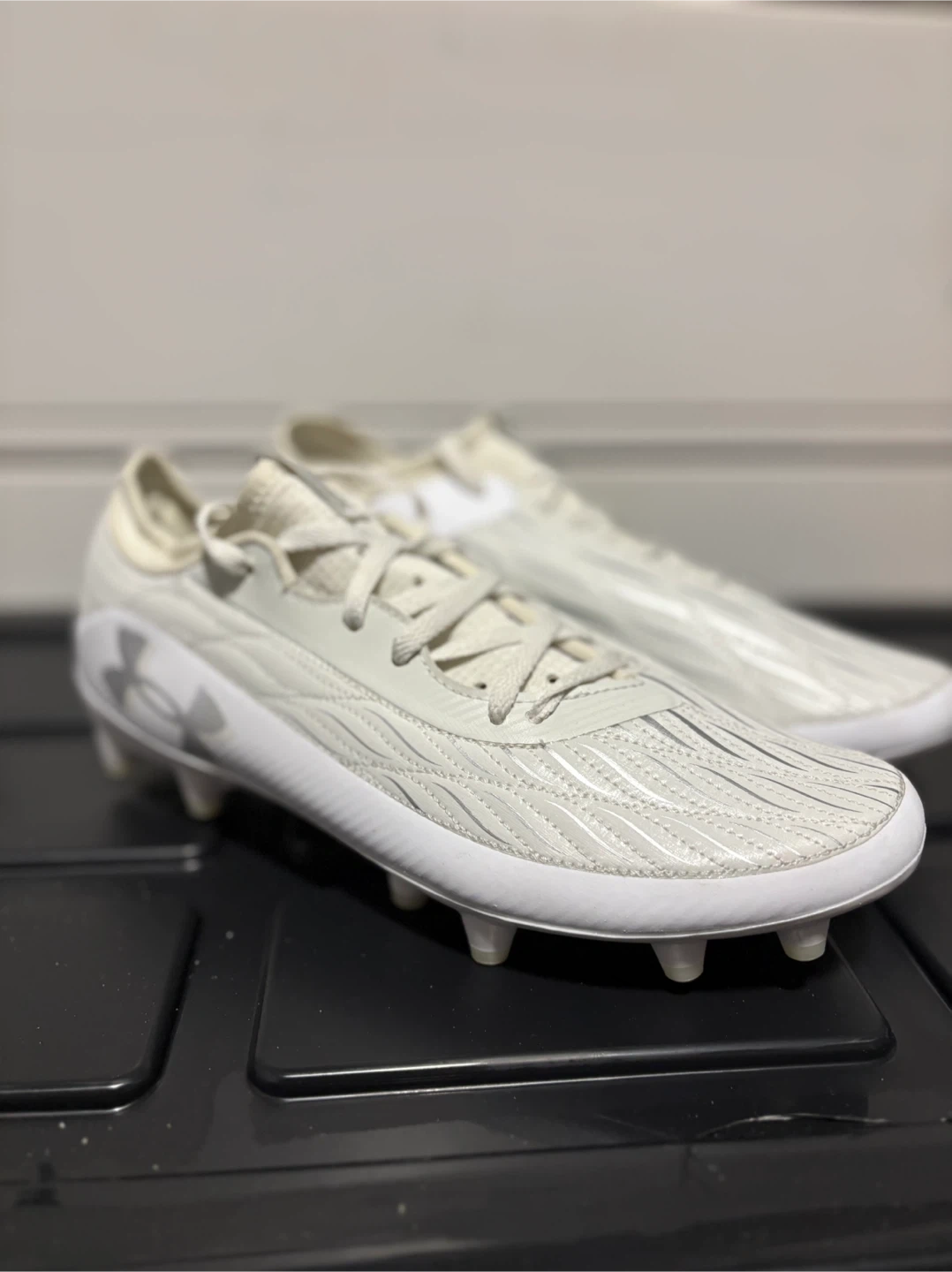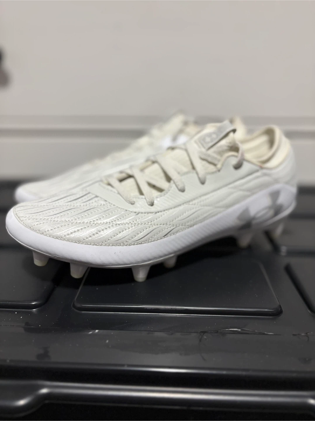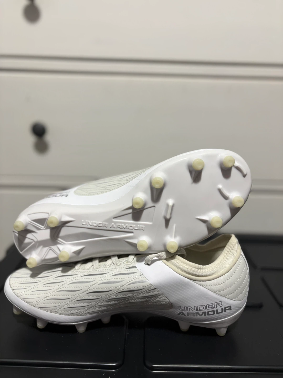 These are Under Armour cleats in white. They have a standard lace-up closure and rubber cleats for traction.