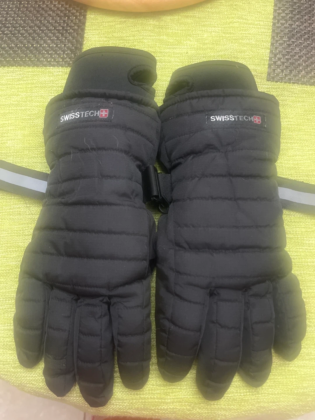 Black winter gloves from Swiss Tech. Padded and insulated for warmth. Features a grippy palm and adjustable wrist strap. Perfect for cold weather activities!