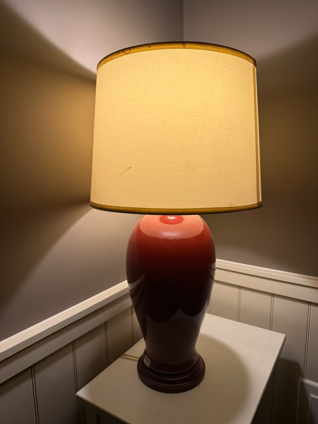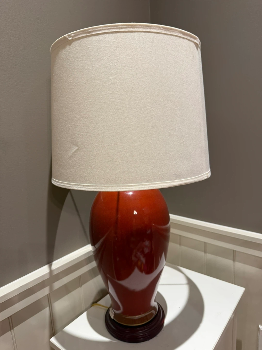 A lovely red ceramic table lamp with a warm, cream-coloured shade. It's a nice accent piece for any room. This lamp would add a cozy glow to a bedroom or living area.