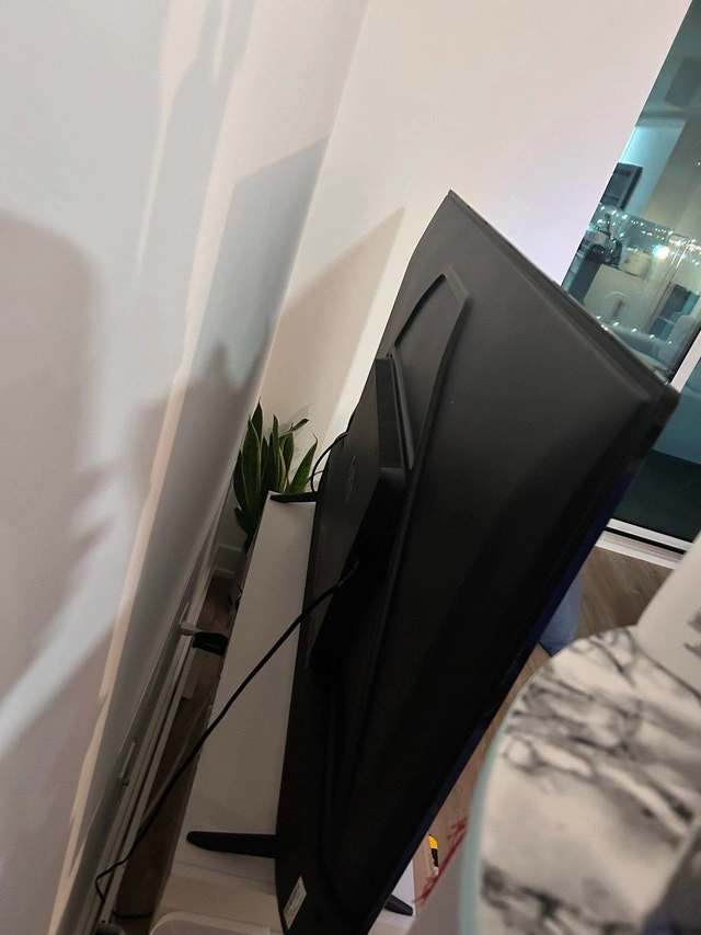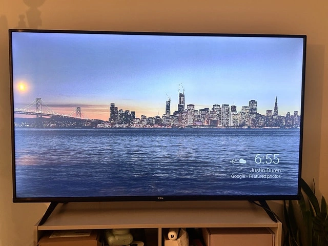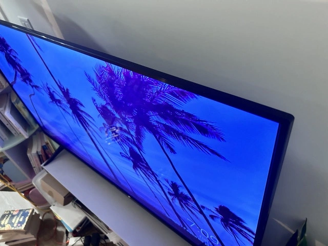 Large screen smart TV. Sleek design. Great for home theatre. Minimalist stand. Excellent picture quality.