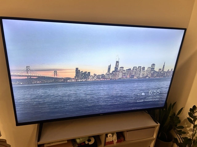 Large screen smart TV. Sleek design. Great for home theatre. Minimalist stand. Excellent picture quality.