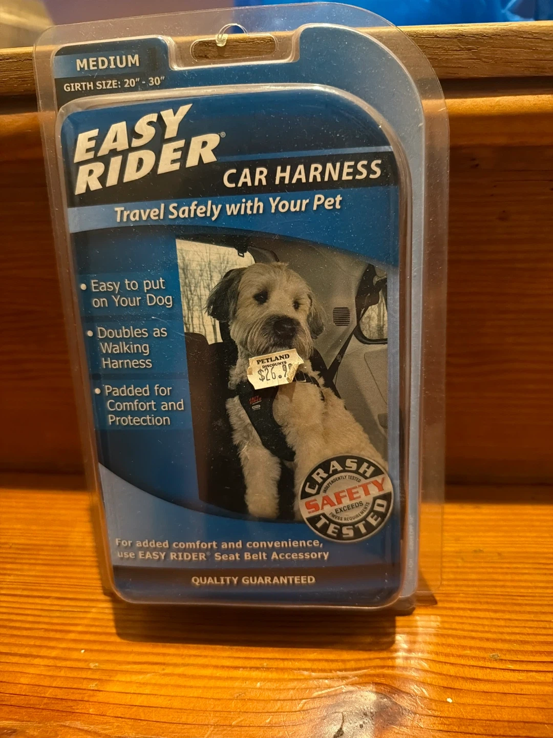 This is an Easy Rider car harness for your pet. It's medium size with a girth of 20" to 30". It's padded for comfort and protection and doubles as a walking harness.