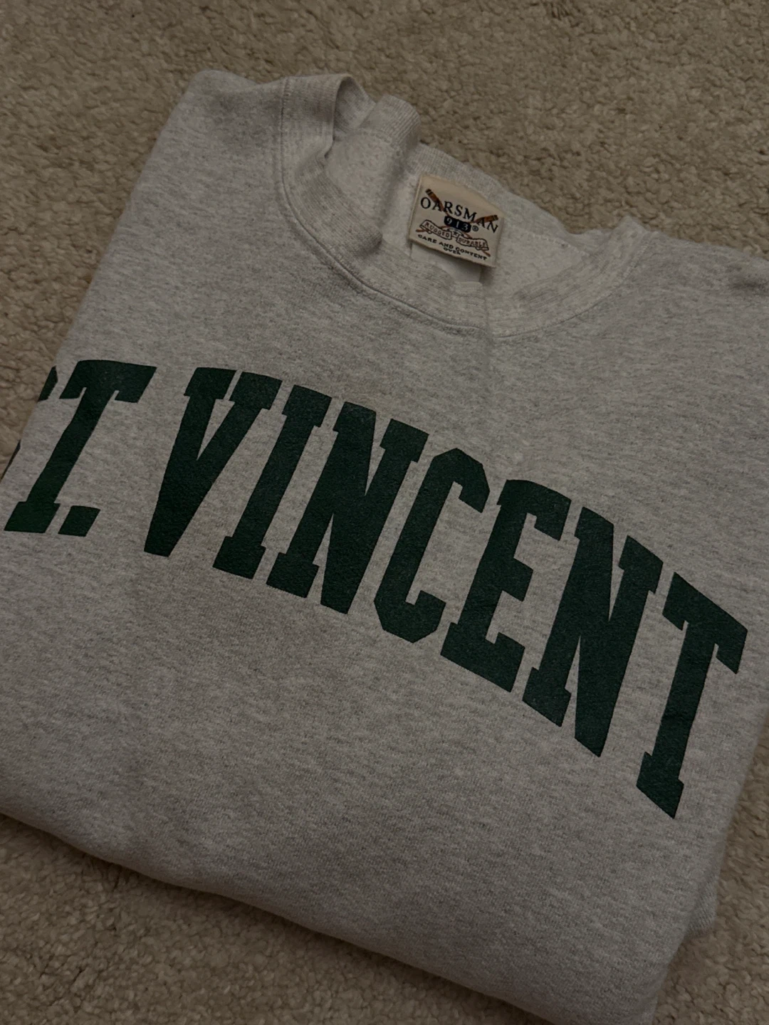 Selling a gently used Oarsman crewneck sweatshirt with 'St. Vincent' printed on the front. It's a cozy and classic piece, perfect for everyday wear!