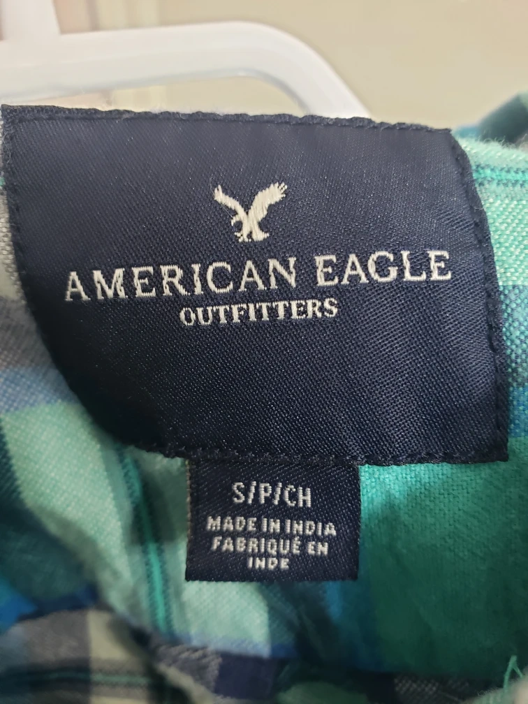 This is a long-sleeved flannel shirt from American Eagle Outfitters. It's a size S/P/CH. The shirt is made of 100% cotton. Great for casual wear!