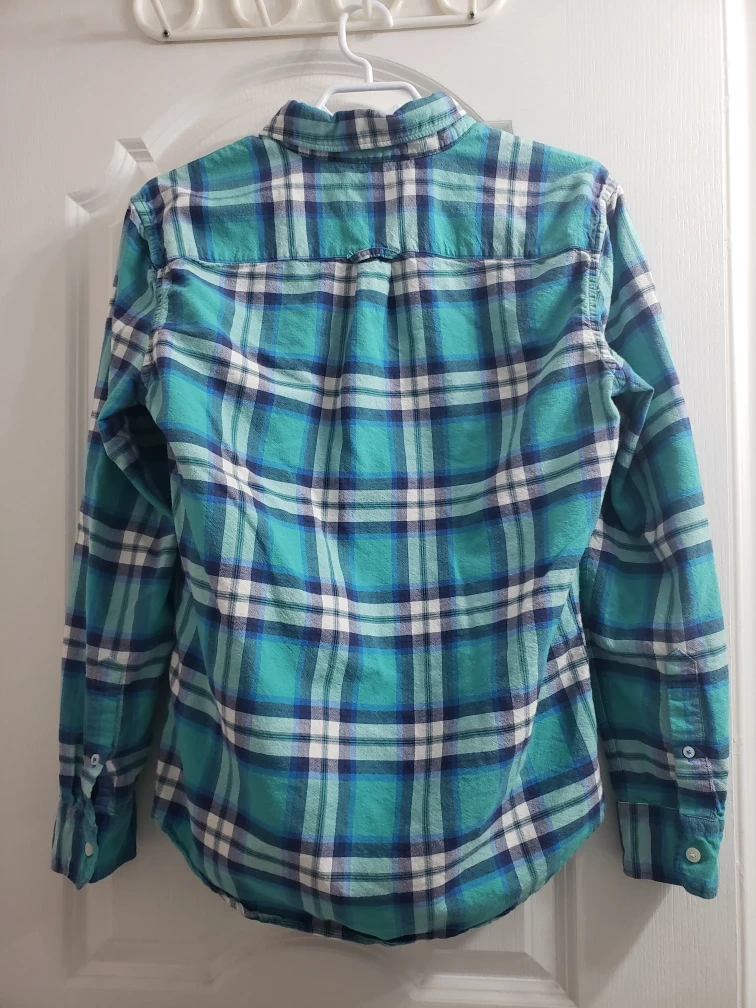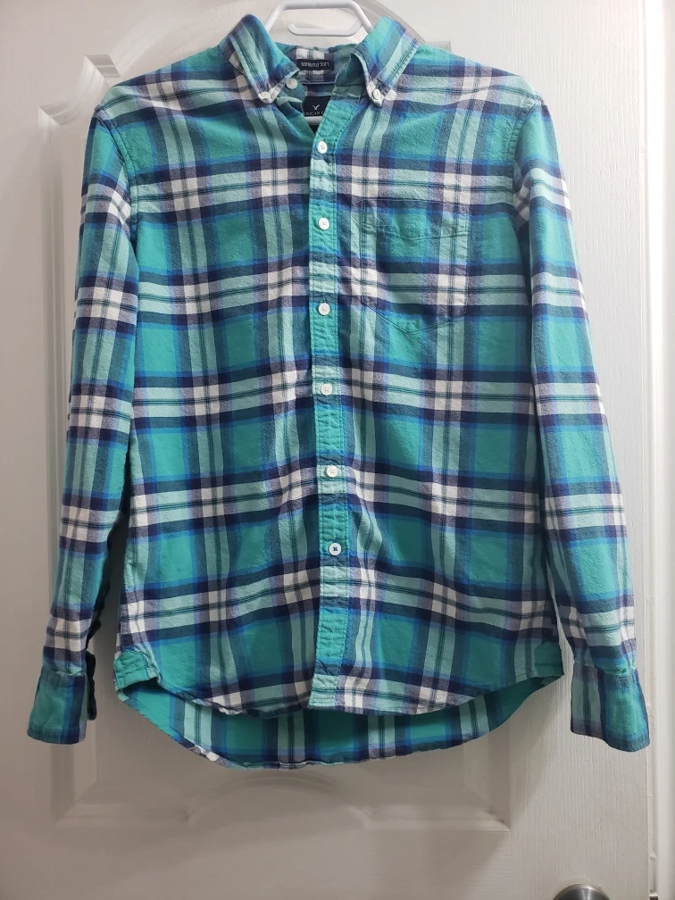 This is a long-sleeved flannel shirt from American Eagle Outfitters. It's a size S/P/CH. The shirt is made of 100% cotton. Great for casual wear!