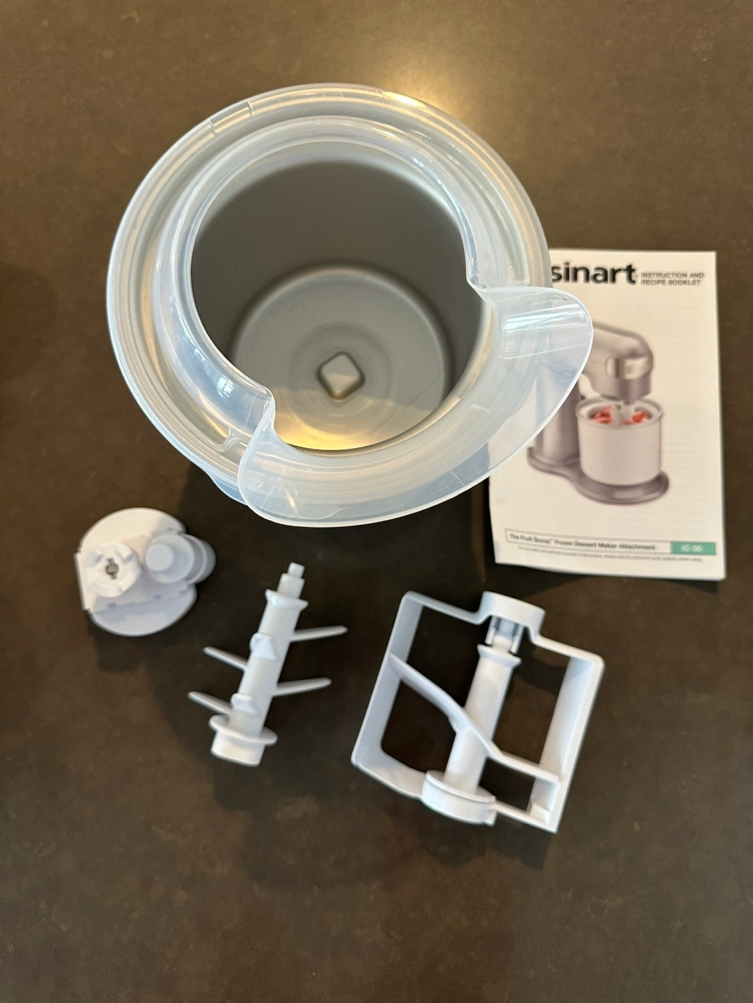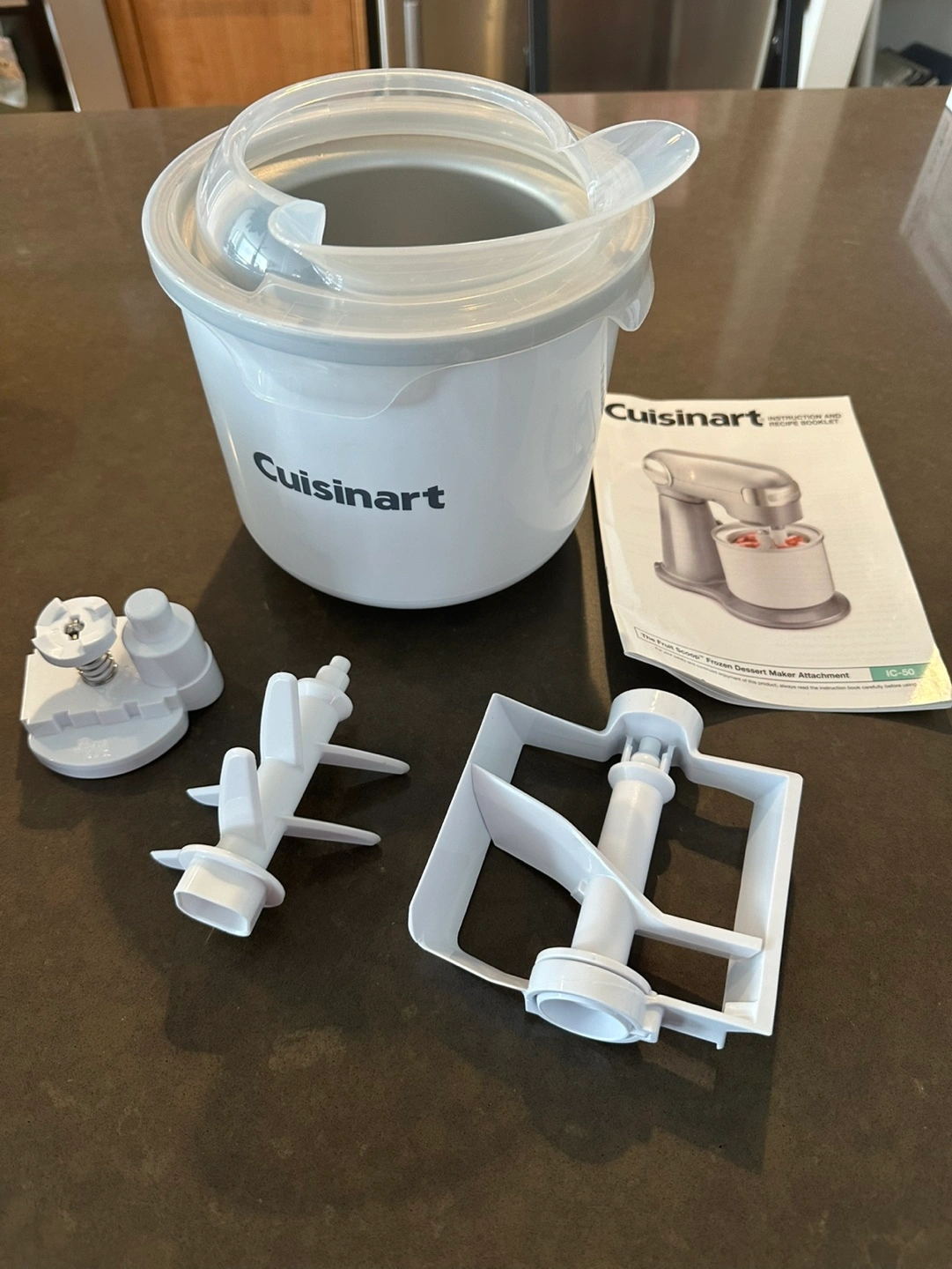New Cuisinart frozen dessert maker attachment. Includes all parts and instructions. Perfect for making ice cream and sorbet.