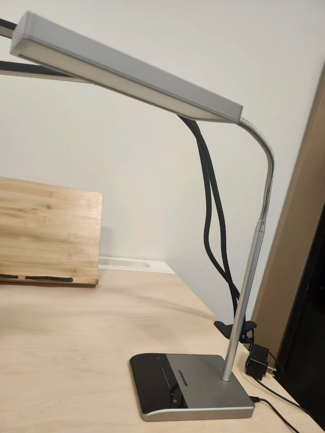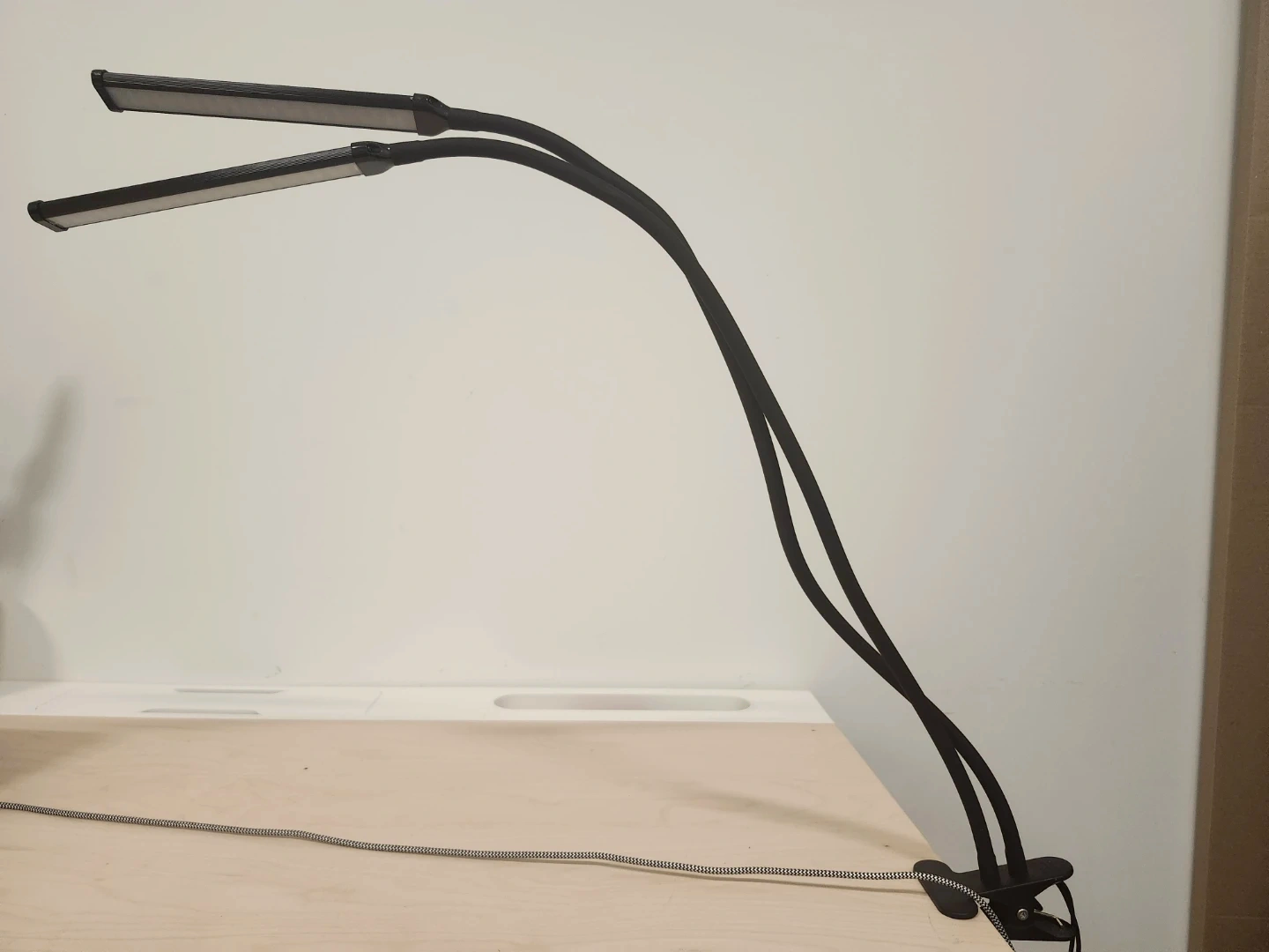 This clip-on desk lamp features dual flexible gooseneck arms for adjustable lighting. It comes with a stable clip base and an AC adapter. The LED light provides bright illumination for various tasks.