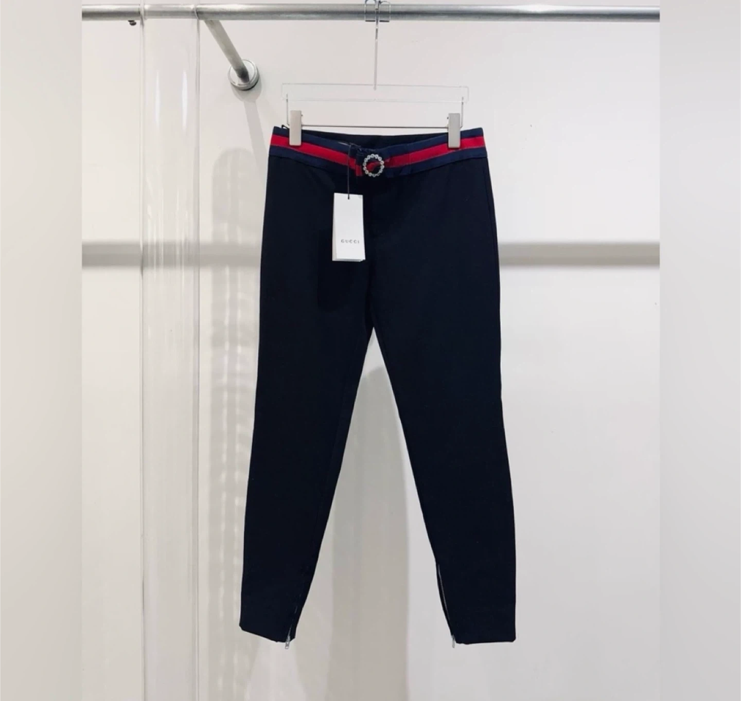 These Gucci trousers are black with a distinctive red and blue stripe detail on the waistband, complete with a jewelled buckle. They are made in Italy and are size 40. Features zippered ankles for a modern fit.