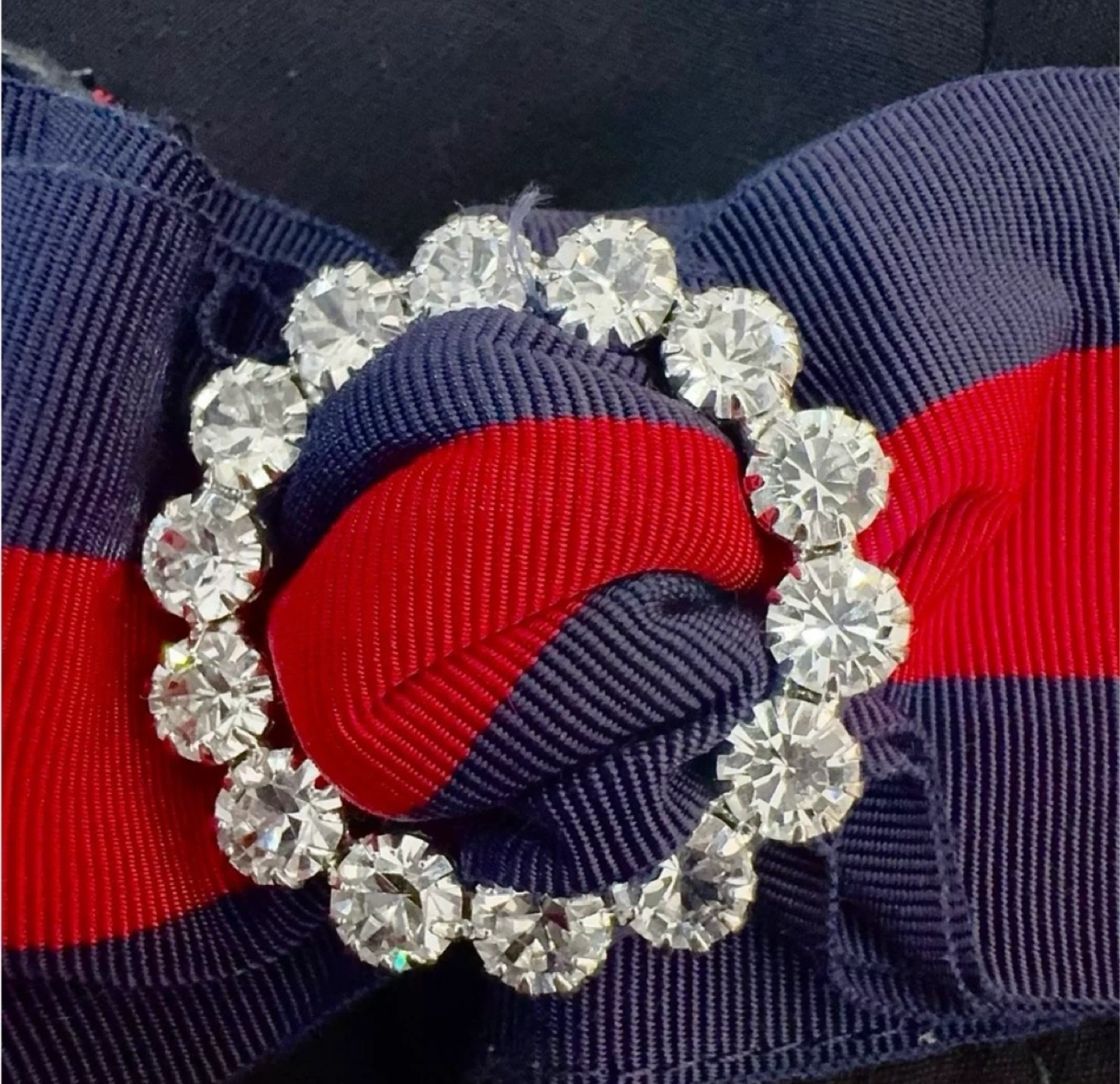 These Gucci trousers are black with a distinctive red and blue stripe detail on the waistband, complete with a jewelled buckle. They are made in Italy and are size 40. Features zippered ankles for a modern fit.