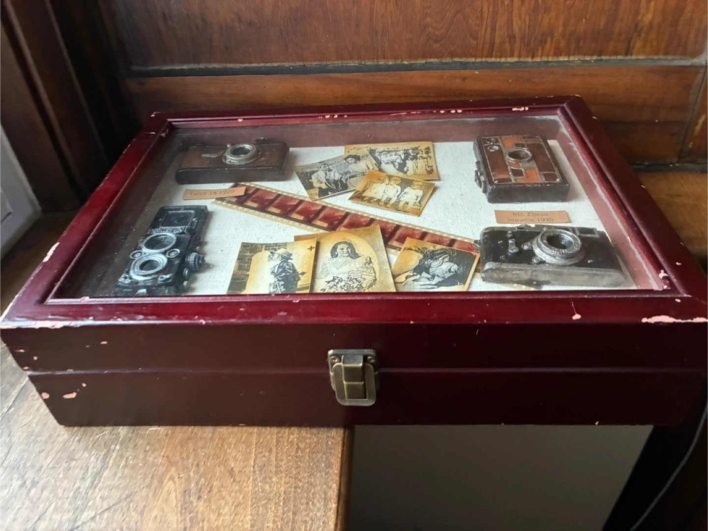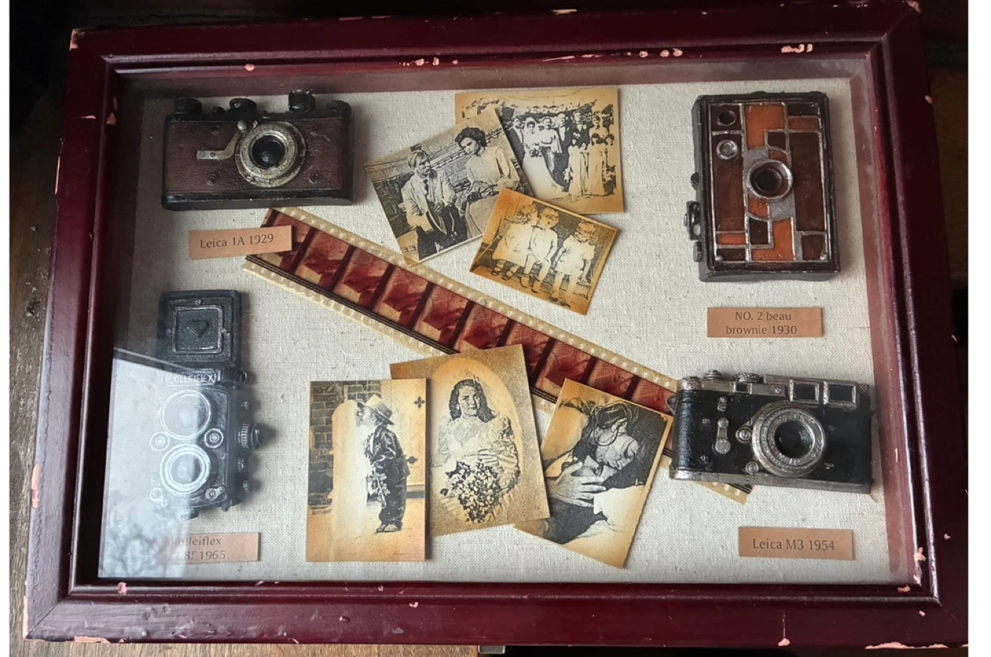 Interesting shadow box the old film and cameras and vintage photos in the upper display portion