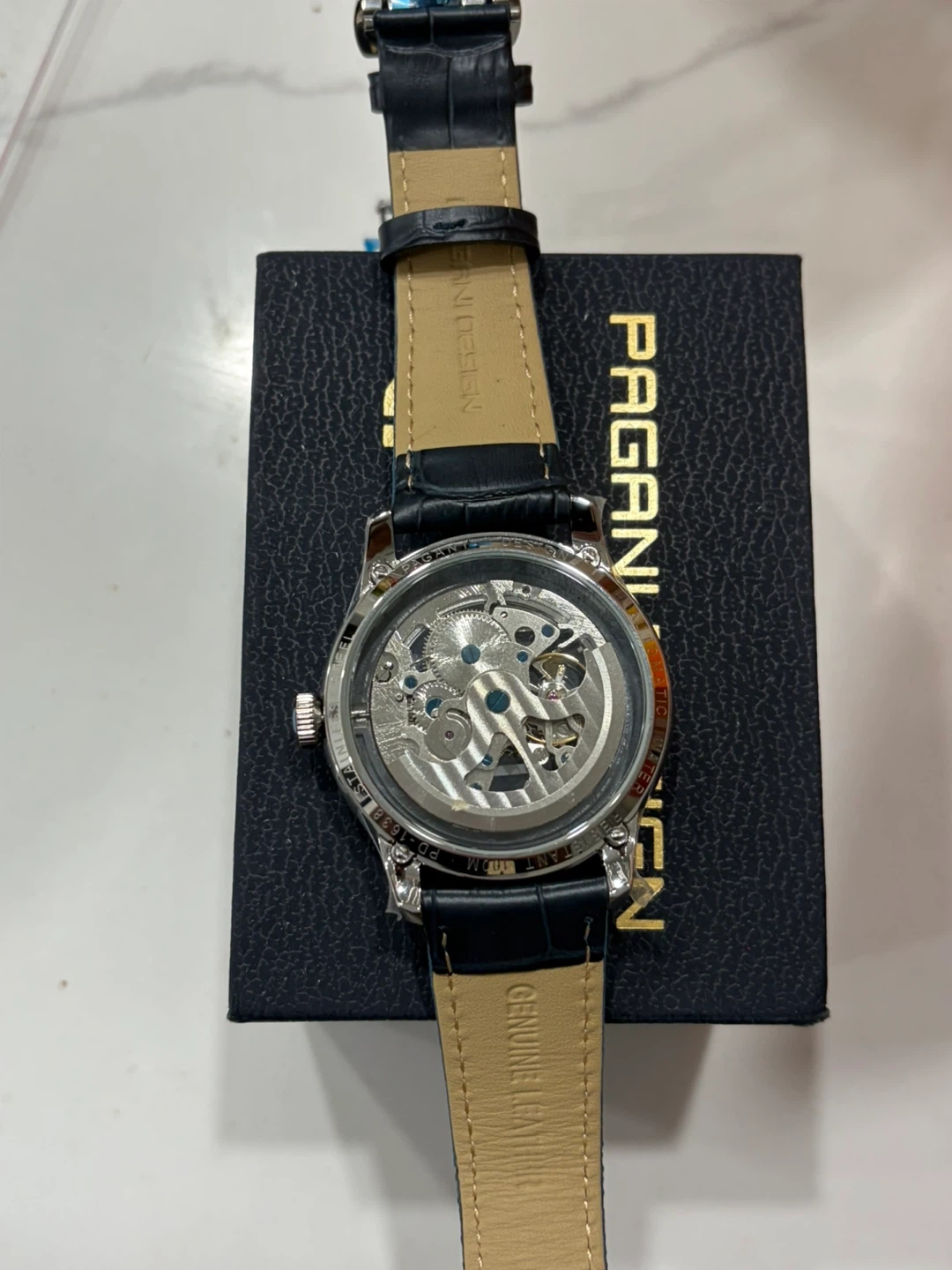 This PAGANI DESIGN watch features a skeleton automatic movement. It has a stainless steel case and a genuine leather strap. The watch comes with its original box.