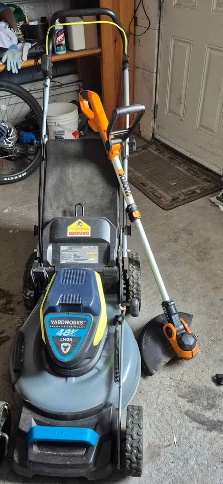 Selling my Yardworks 48V cordless lawnmower + WORX trimmer combo.