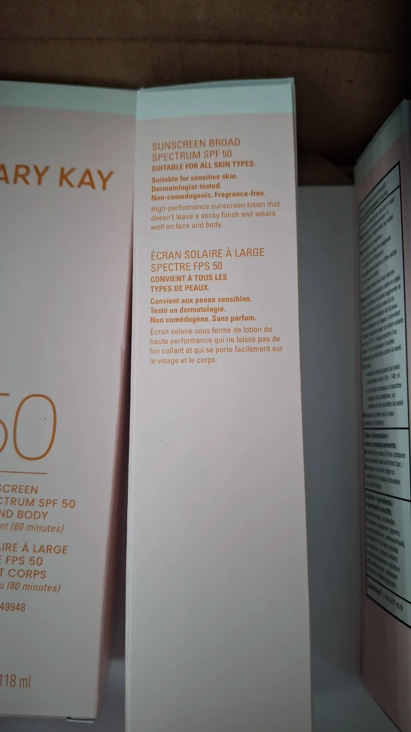 Mary Kay SPF 50 sunscreen for face and body. Water-resistant for 80 minutes. Suitable for all skin types, dermatologist-tested and fragrance-free. 4 FL. OZ. / 118 mL.