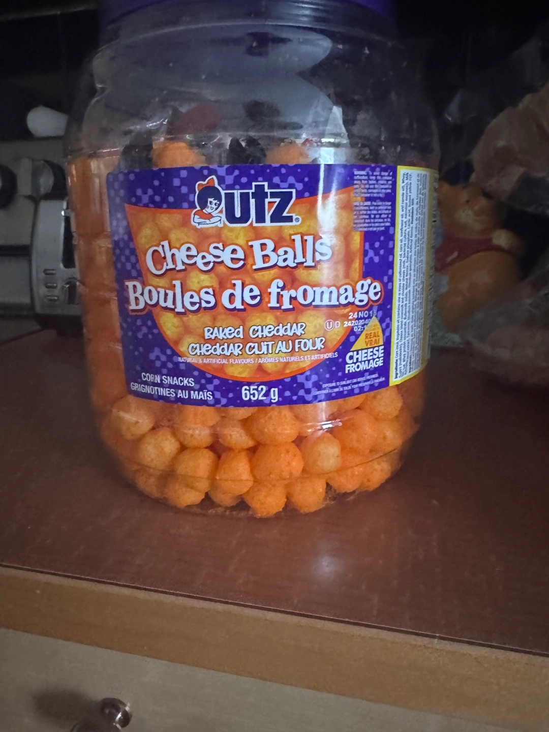 🆓Here's a big ol' container of Utz Cheese Balls! Perfect for snacking. The container is 652g of baked cheddar goodness. Opened but only a handful taken and not to our liking.