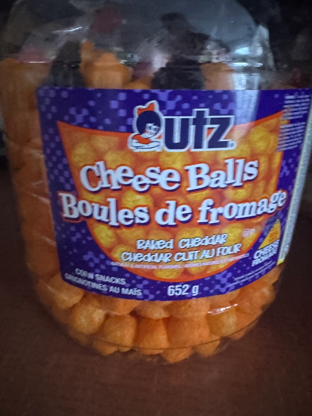 🆓Here's a big ol' container of Utz Cheese Balls! Perfect for snacking. The container is 652g of baked cheddar goodness. Opened but only a handful taken and not to our liking.