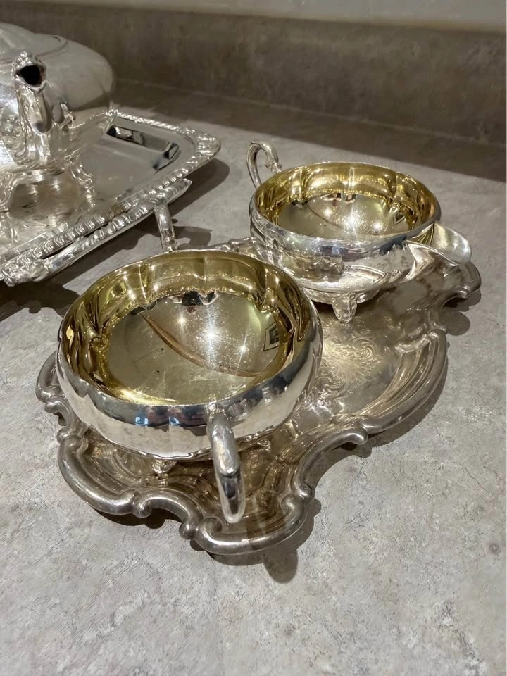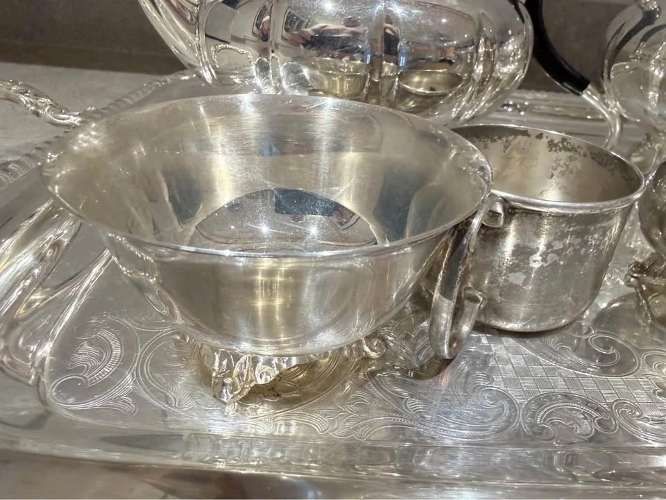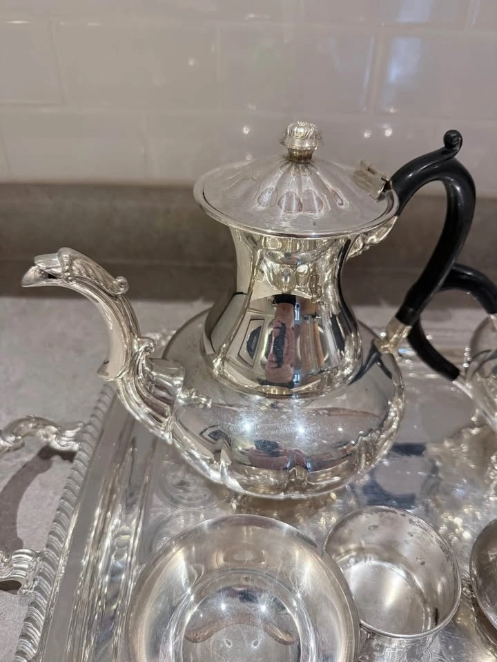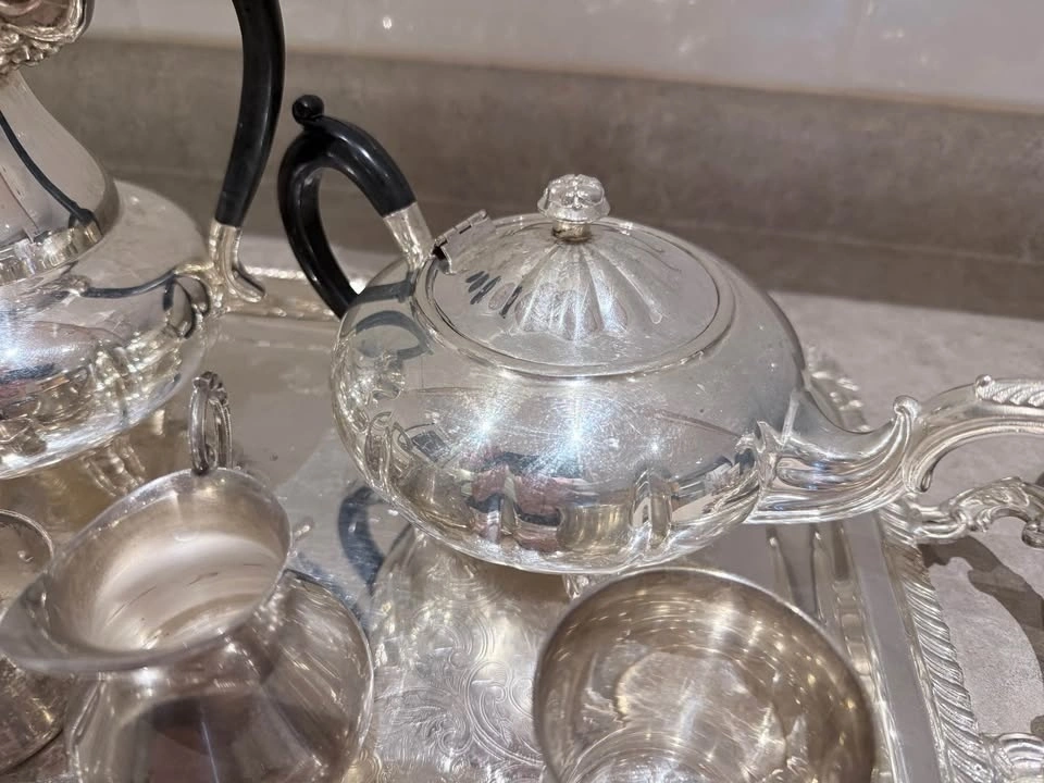 Vintage silver plated tea set. Marlboro Plate E.P. Copper refers to vintage Canadian-made silver-plated hollowware (trays, teapots, goblets) by Morton Parker, featuring a copper base with a silver plating (Electroplated/E.P.), often marked with "Lead Mounts" for weighted bases and "Made in Canada," popular for decorative serving pieces. These items, made from the mid-20th century, show signs of age like patina but are sought for their classic style. 95$ OBO