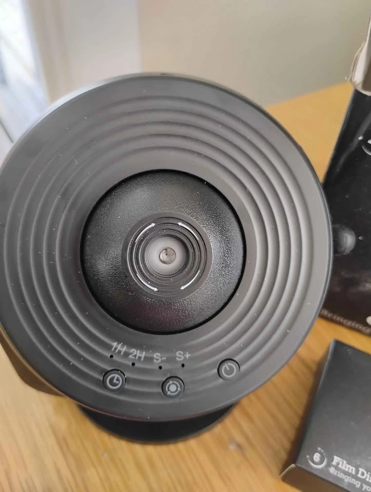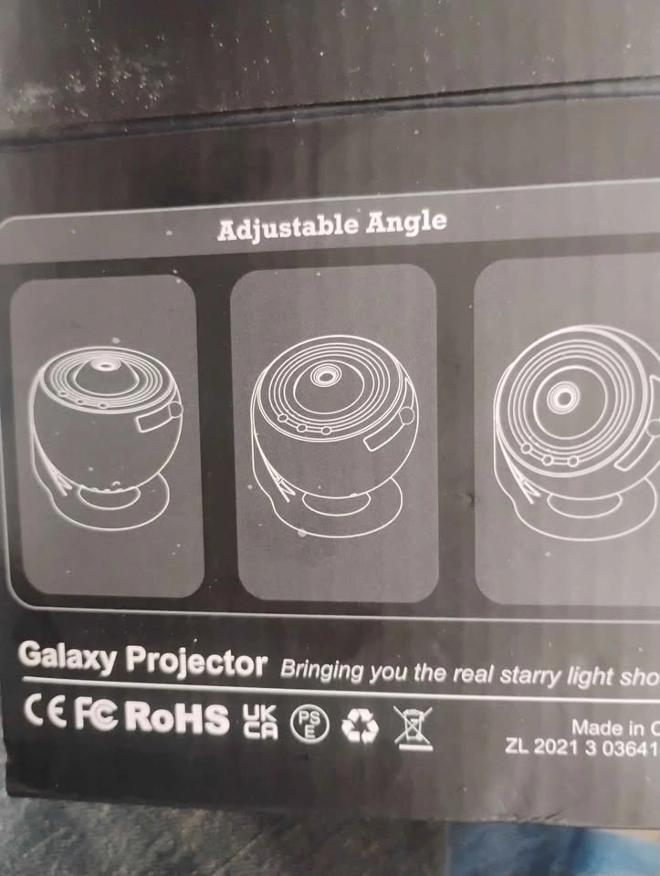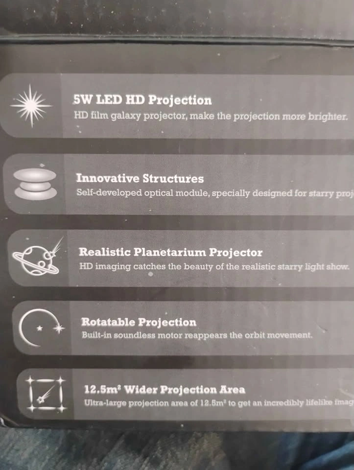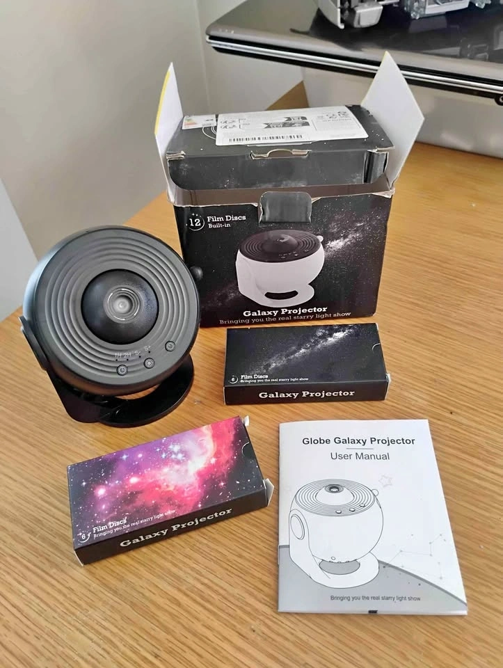 Awesome galaxy projector for your room or space. Has 18 film discs for different starry light shows. HD projection with a wide 12.5m² area. Rotatable projection and a quiet motor. Comes with the user manual.
