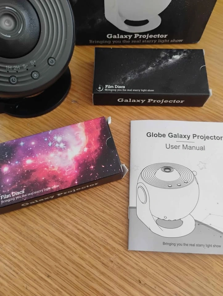 Awesome galaxy projector for your room or space. Has 18 film discs for different starry light shows. HD projection with a wide 12.5m² area. Rotatable projection and a quiet motor. Comes with the user manual.