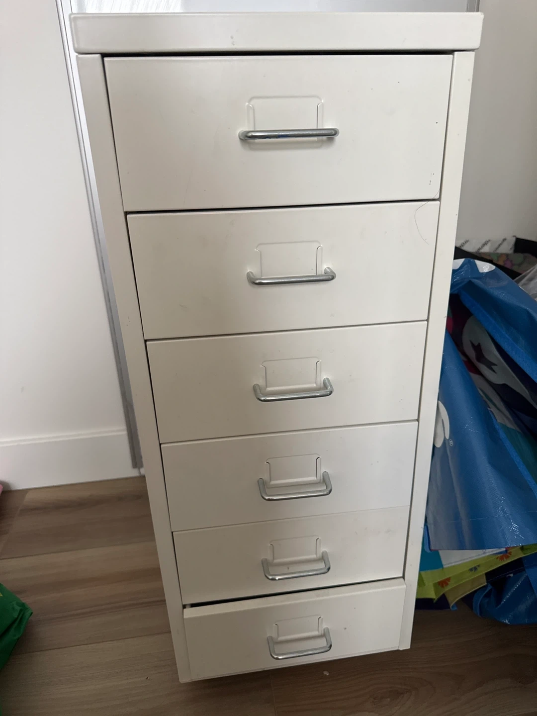 This is a white metal filing cabinet with six drawers. It's great for organizing office supplies or documents. Last drawer is hard to open but functional.
