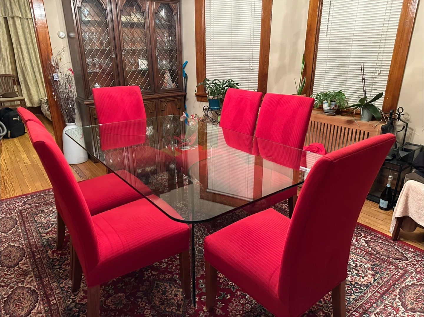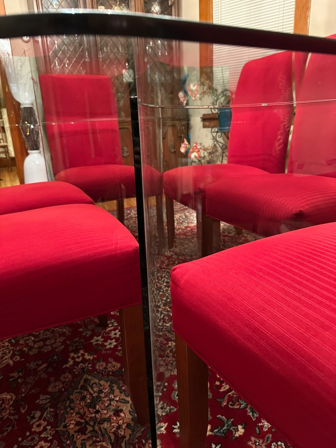 Selling a glass top dining table that comes with 6 red upholstered chairs. It would be a great addition to any dining room. The chairs are a vibrant red color and the glass top is in good condition. Feel free to ask any questions!