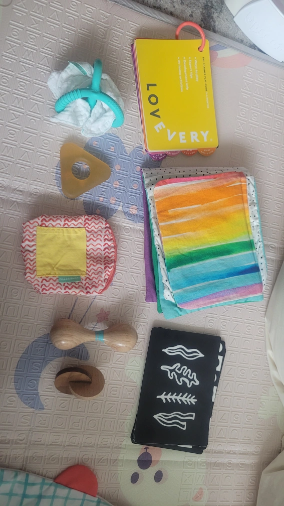 Baby play kit includes various textured toys and learning materials. Wooden rattle, teethers, crinkle bag, soft book, cards, and more. Great for sensory development.