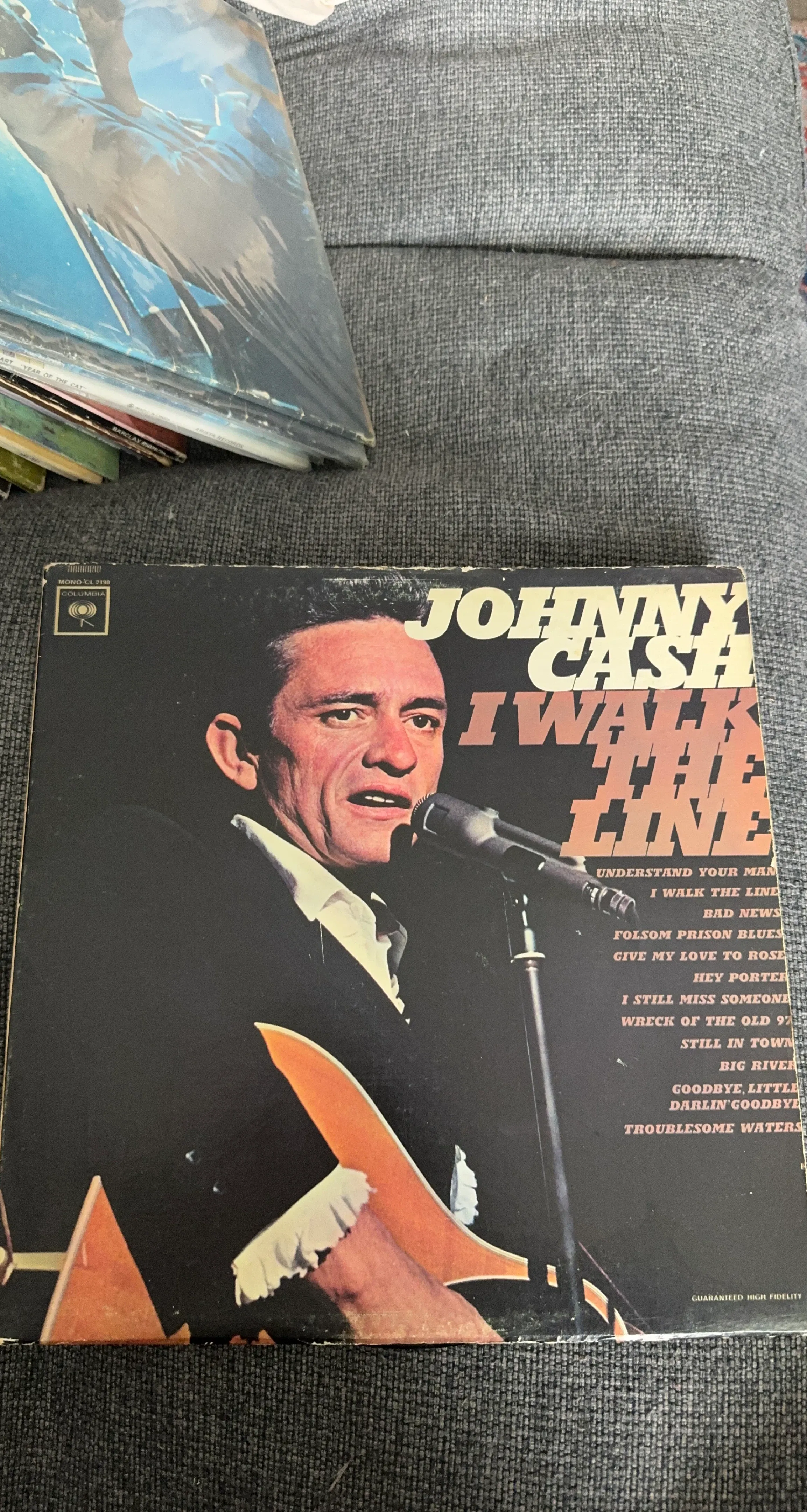 Johnny Cash's I Walk the Line vinyl record, CL 1539. This Columbia High Fidelity recording features songs like 'Understand Your Man' and 'Folsom Prison Blues'.