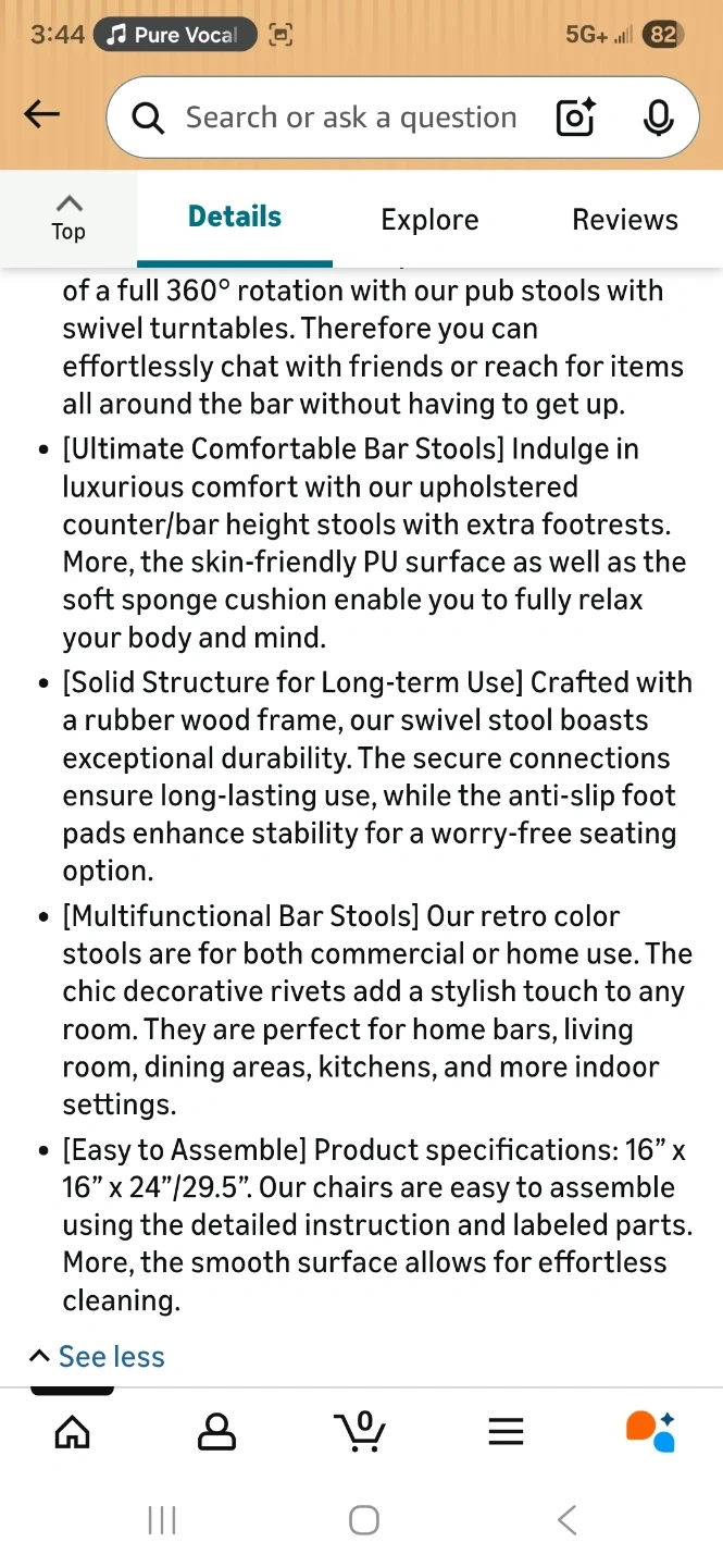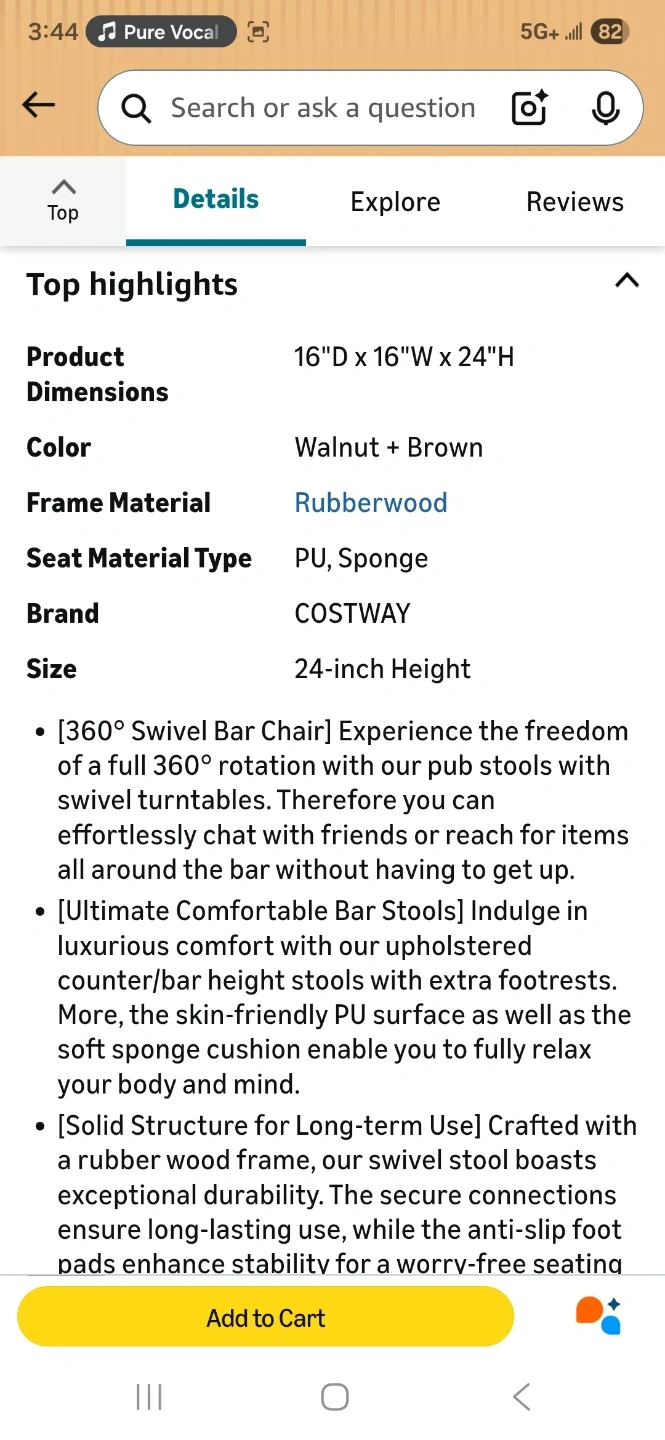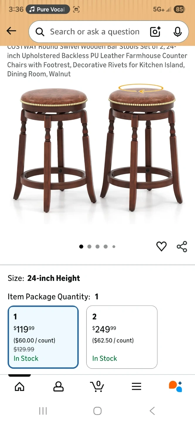 Selling a set of 2 COSTWAY round swivel wooden bar stools. They're 24-inches in height and come in a walnut and brown color. The frame is made of rubberwood, and the seat is PU sponge. These stools are easy to assemble and have a solid structure for long-term use. They also have decorative rivets that add a stylish touch to any room. The original price was $150