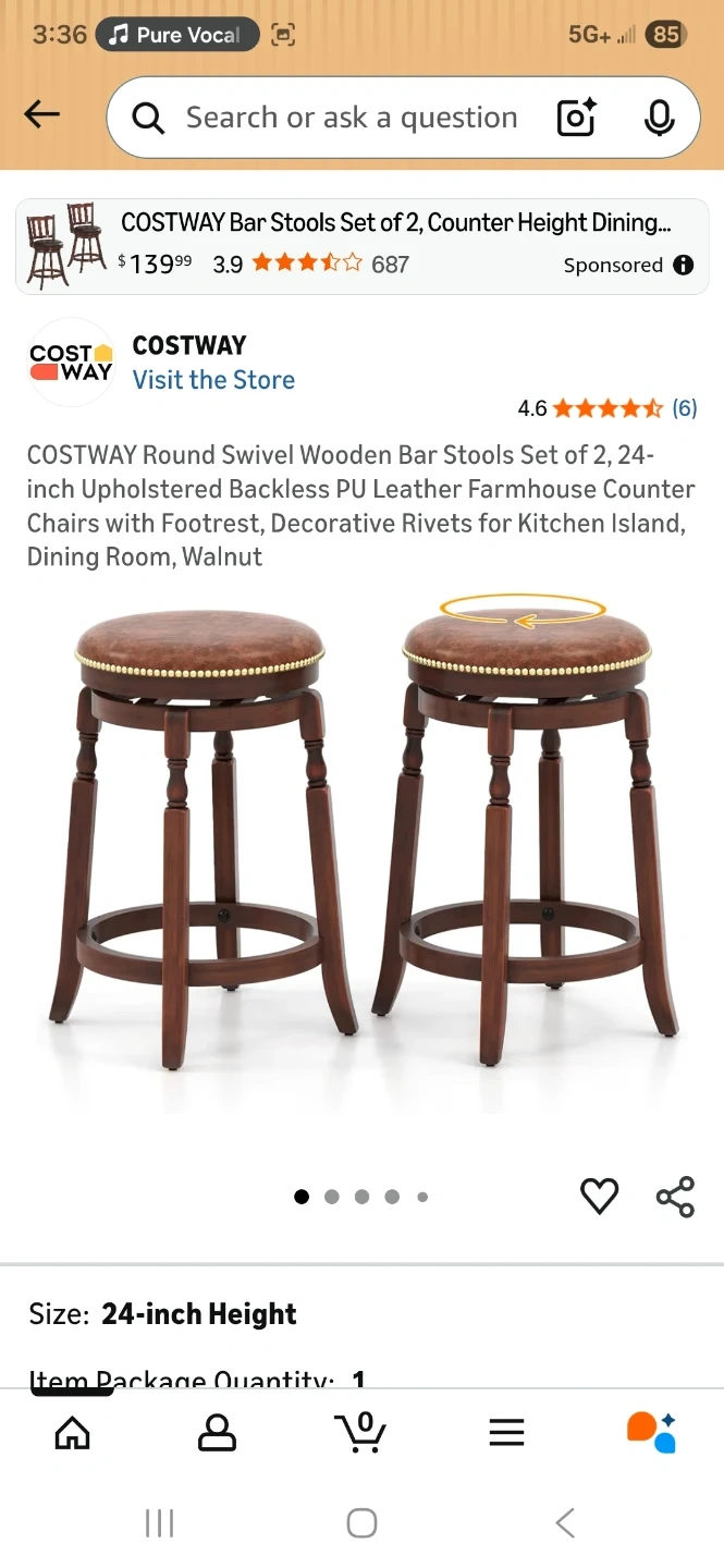 Selling a set of 2 COSTWAY round swivel wooden bar stools. They're 24-inches in height and come in a walnut and brown color. The frame is made of rubberwood, and the seat is PU sponge. These stools are easy to assemble and have a solid structure for long-term use. They also have decorative rivets that add a stylish touch to any room. The original price was $150