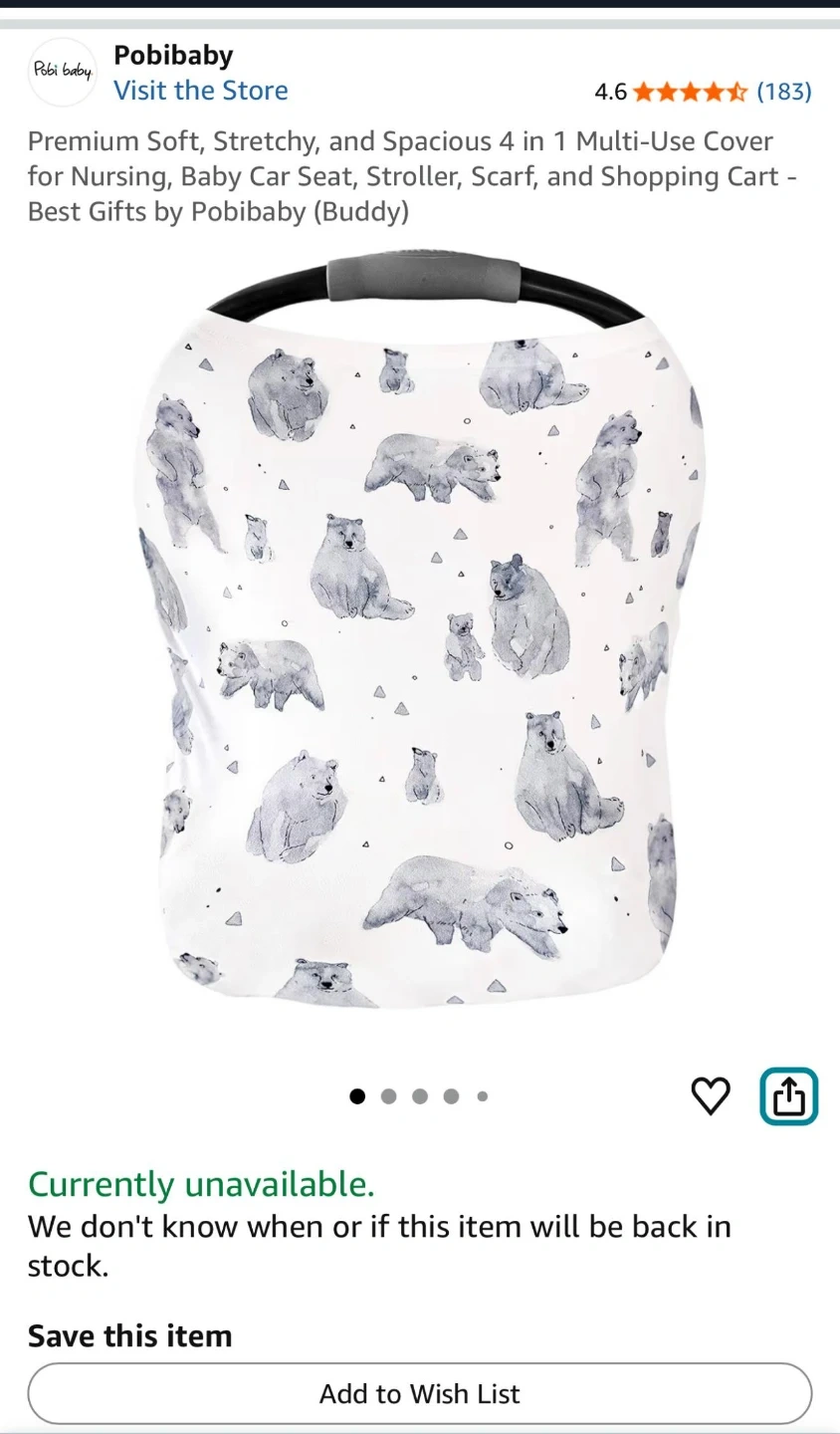 This is a soft, stretchy, and spacious 4-in-1 multi-use cover from Pobibaby. It's designed for nursing, baby car seats, strollers, scarves, and shopping carts. The cover features a cute bear print.