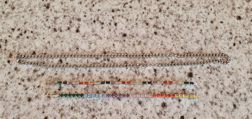 2 rainbow tennis bracelets and a neck chain. Bracelets are 7" and the chain is 22". Worn once for a photo shoot. Original price was $130 after tax and shipping. Fun, colorful costume jewelry!