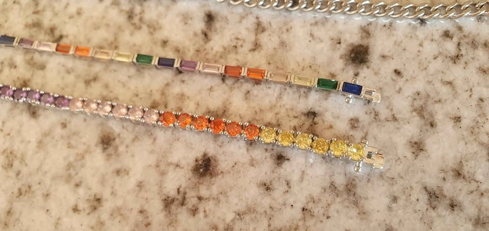 2 rainbow tennis bracelets and a neck chain. Bracelets are 7" and the chain is 22". Worn once for a photo shoot. Original price was $130 after tax and shipping. Fun, colorful costume jewelry!