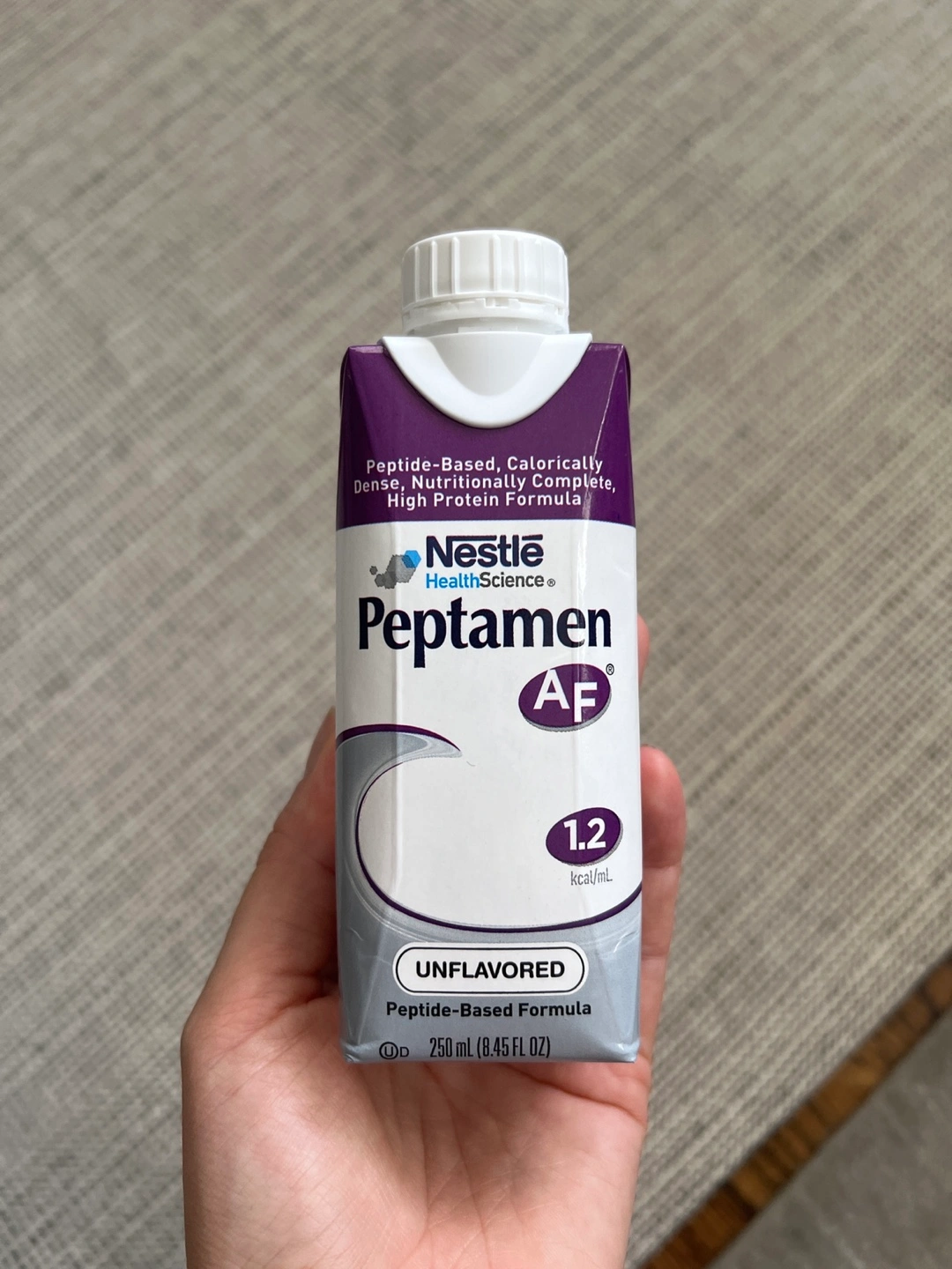 Selling a Nestle HealthScience Peptamen AF unflavored formula. It is a peptide-based, calorically dense, nutritionally complete, high protein formula. The container holds 250 mL (8.45 FL OZ).