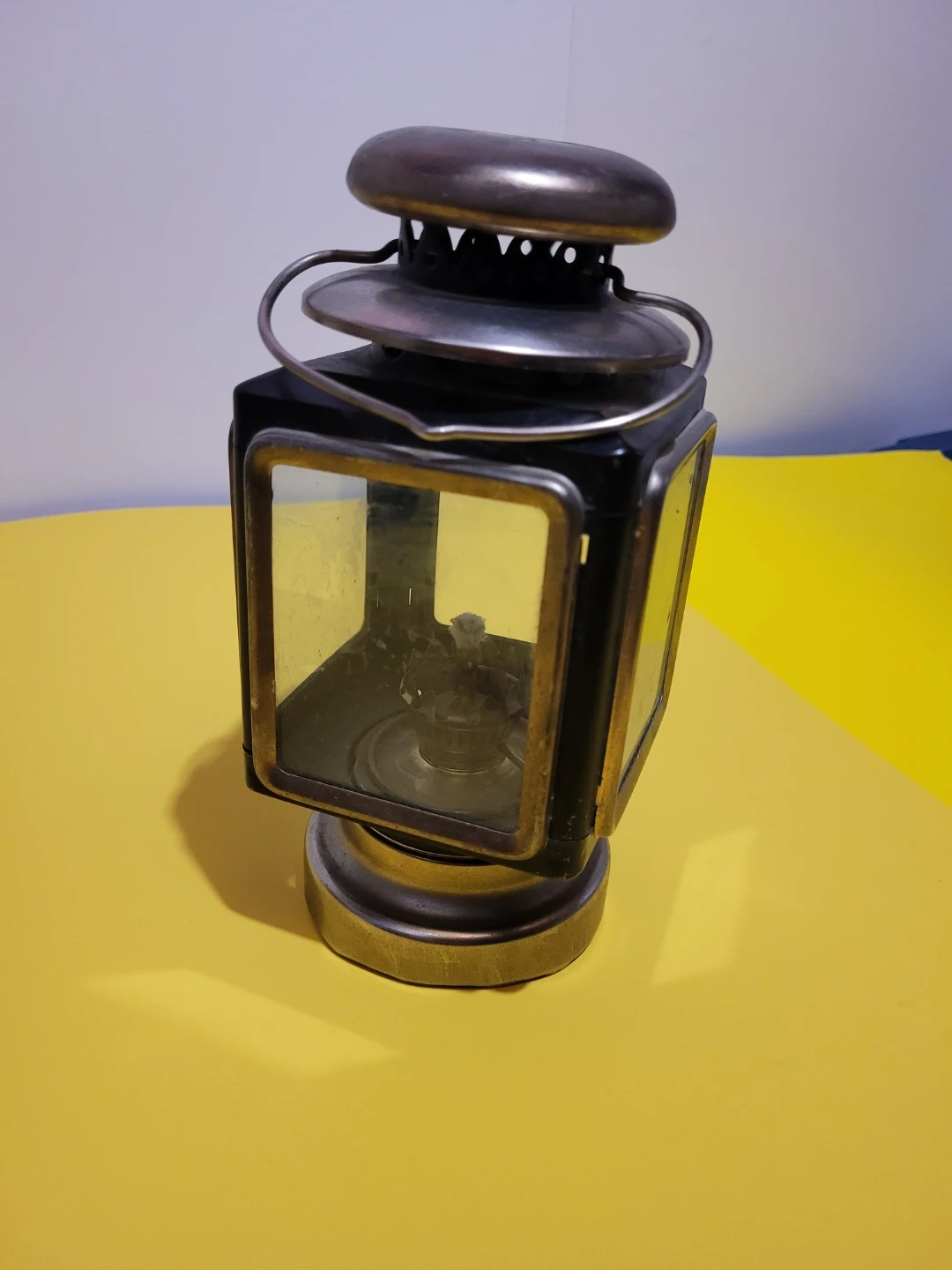 This is a vintage oil lantern with glass panes. It's made of metal and glass. The burner assembly and base are removable.