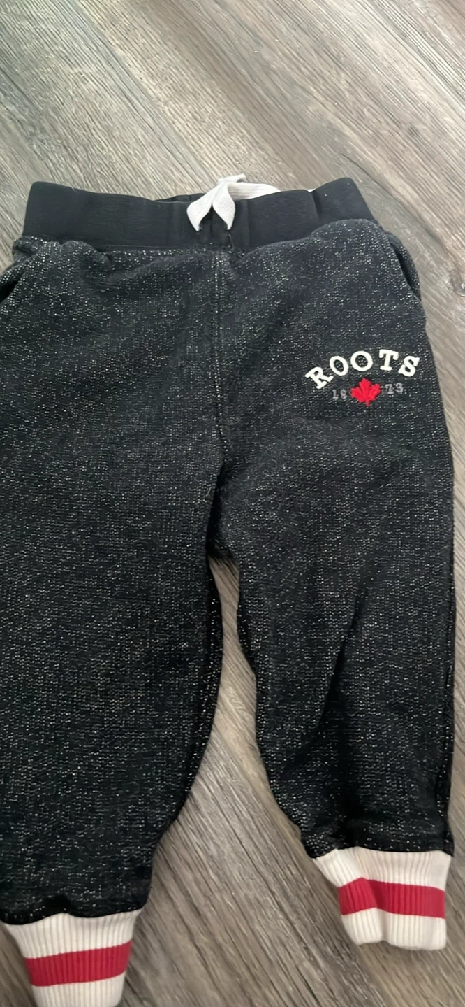 These Roots sweatpants are a sparkly black colour. They have a white drawstring and red and white striped cuffs. A small red maple leaf with 'ROOTS 1873' embroidered on the left leg.