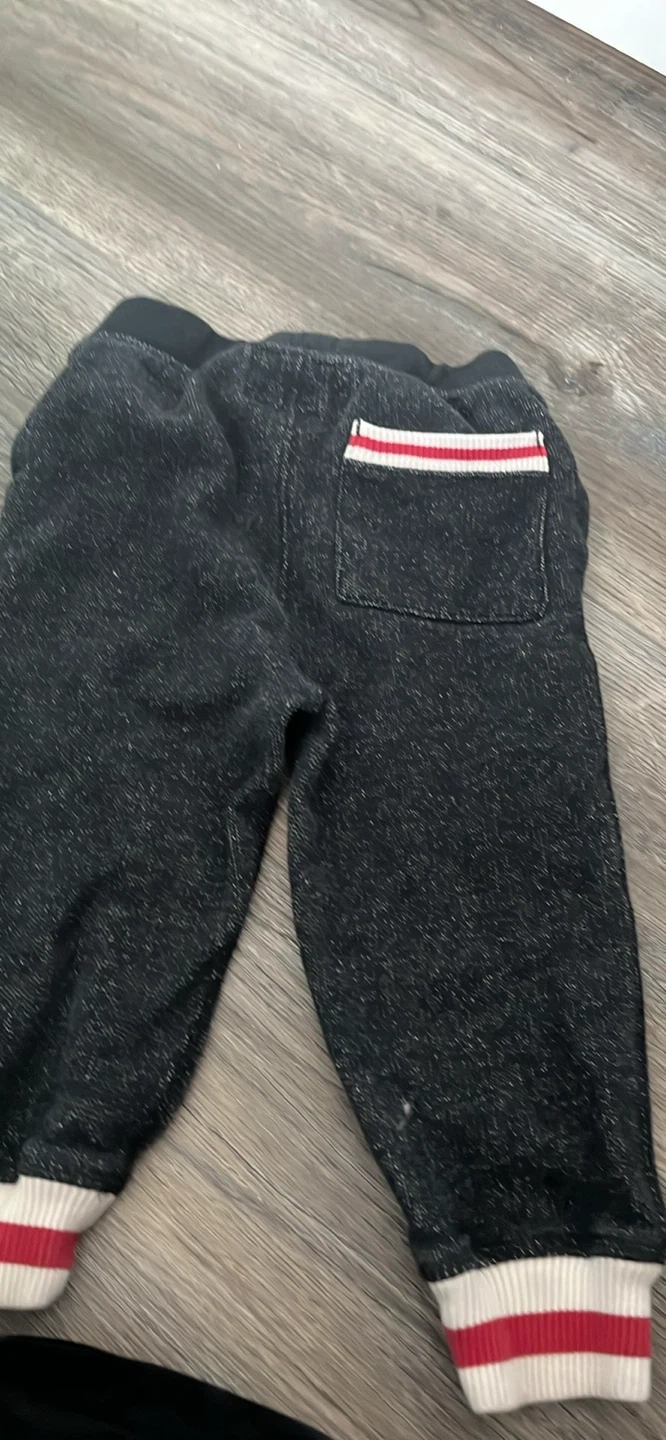 These Roots sweatpants are a sparkly black colour. They have a white drawstring and red and white striped cuffs. A small red maple leaf with 'ROOTS 1873' embroidered on the left leg.