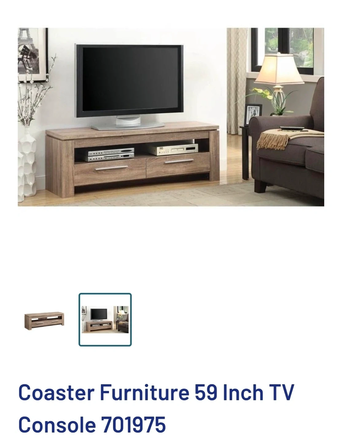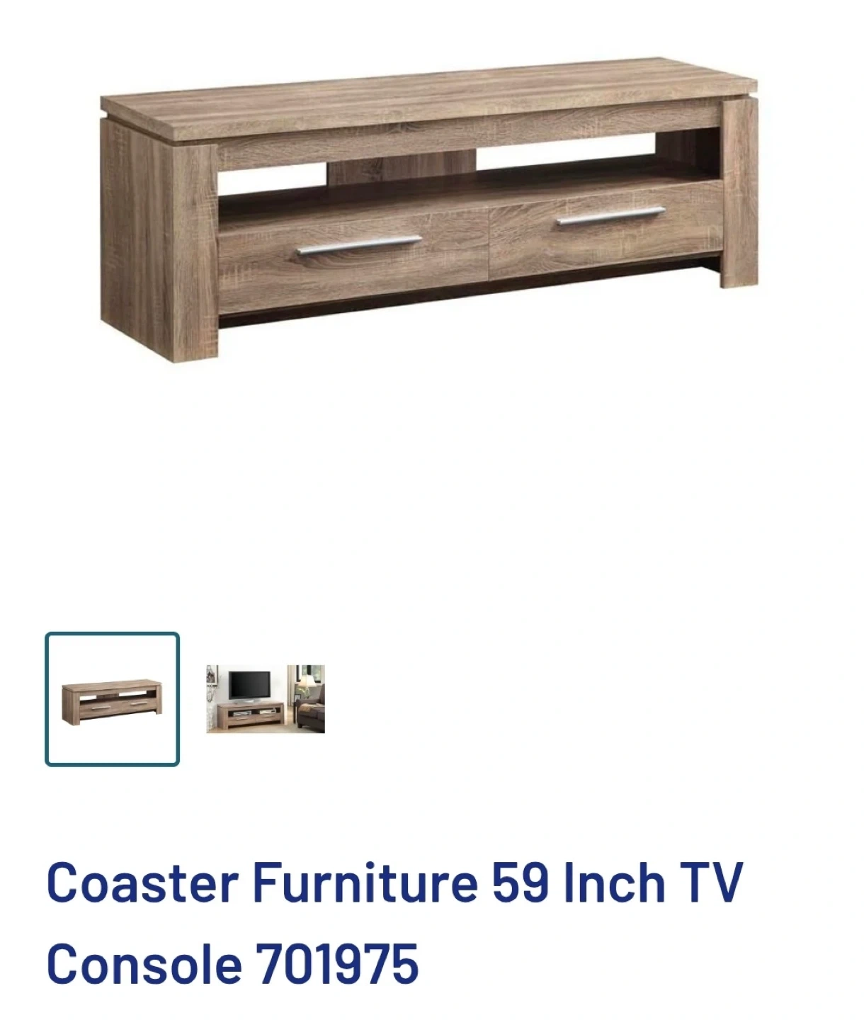 This is a Coaster Furniture 59 inch TV console. It features two drawers and open shelving. The finish is a light wood grain.